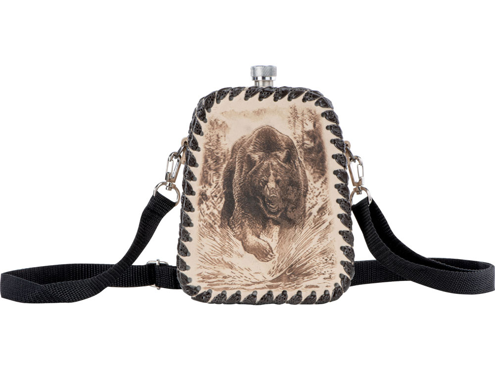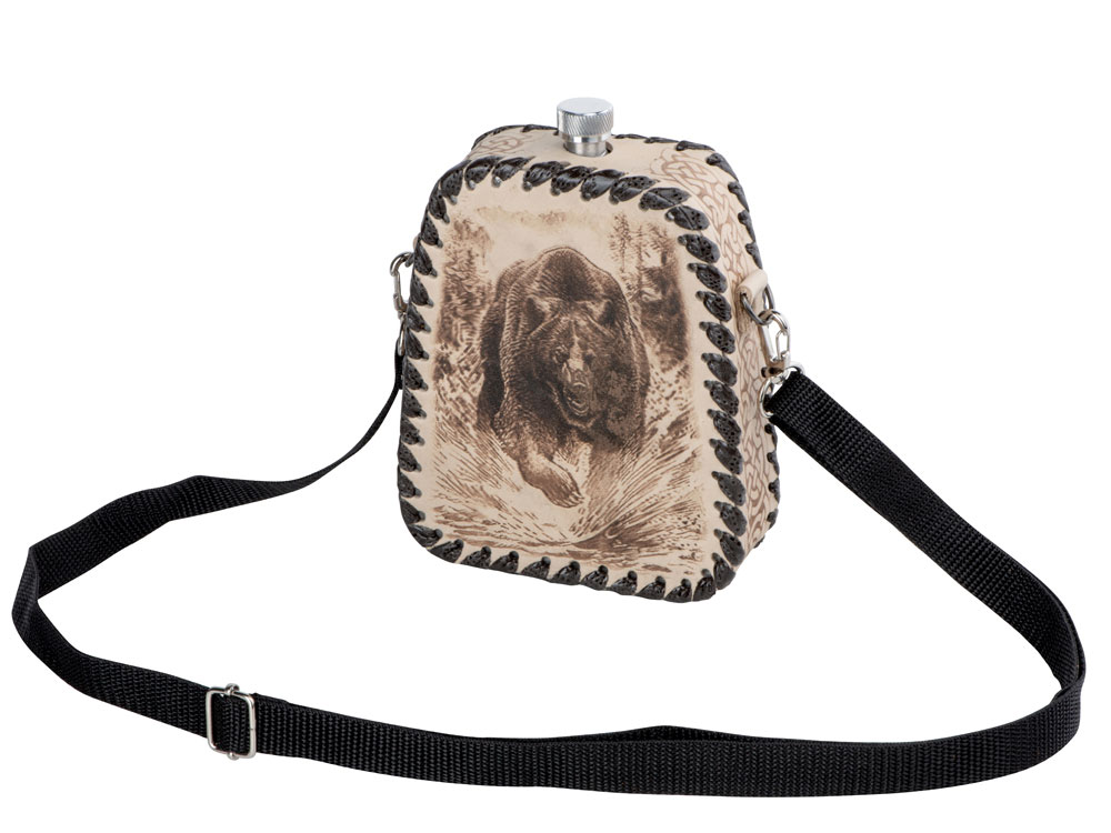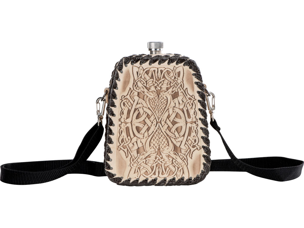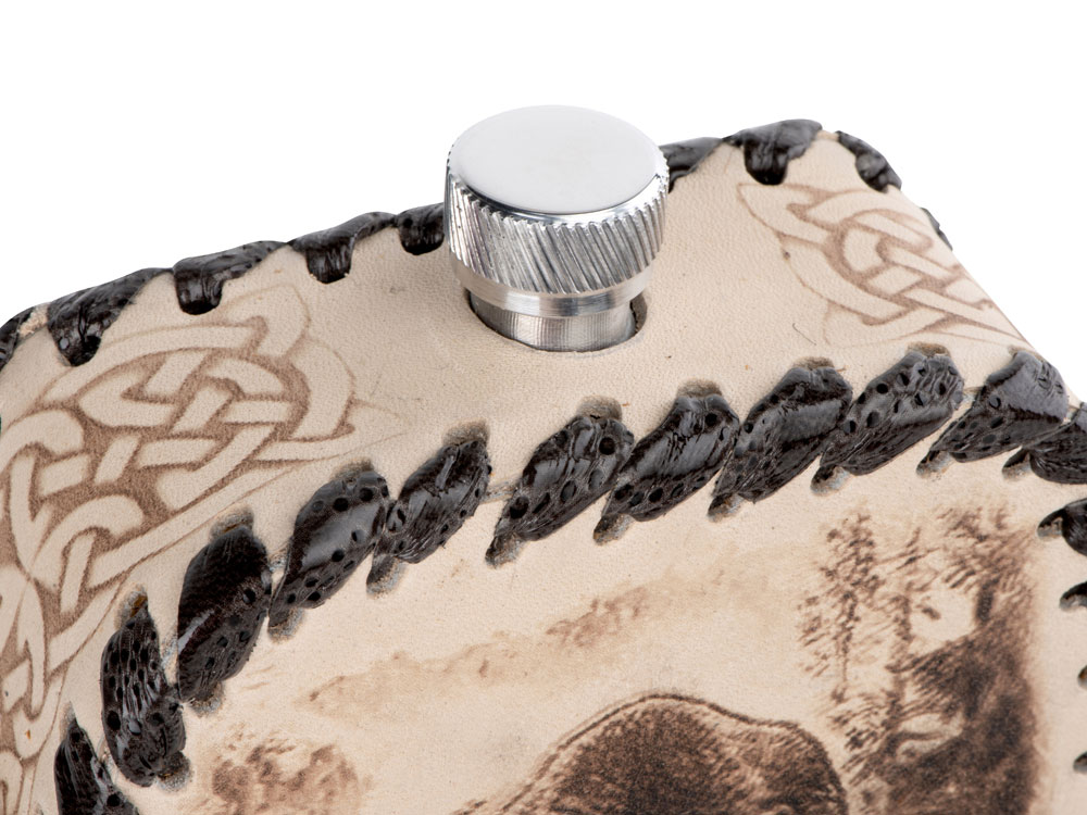 Фляга 1,5л в оплетке из натуральной кожи с нанесением рисунка методом художественного выжигания.