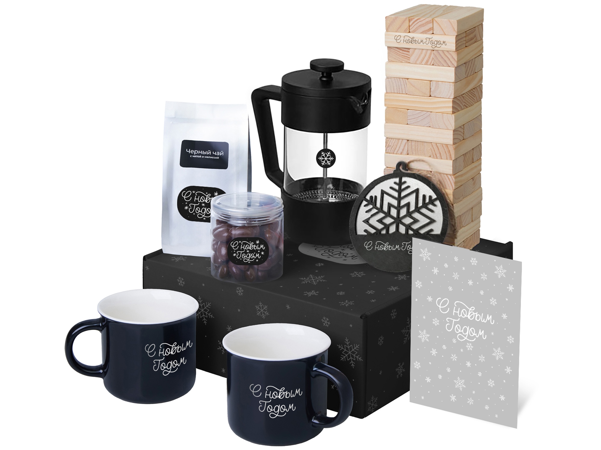 Подарочный набор c френчпрессом, кружками и чаем, черный