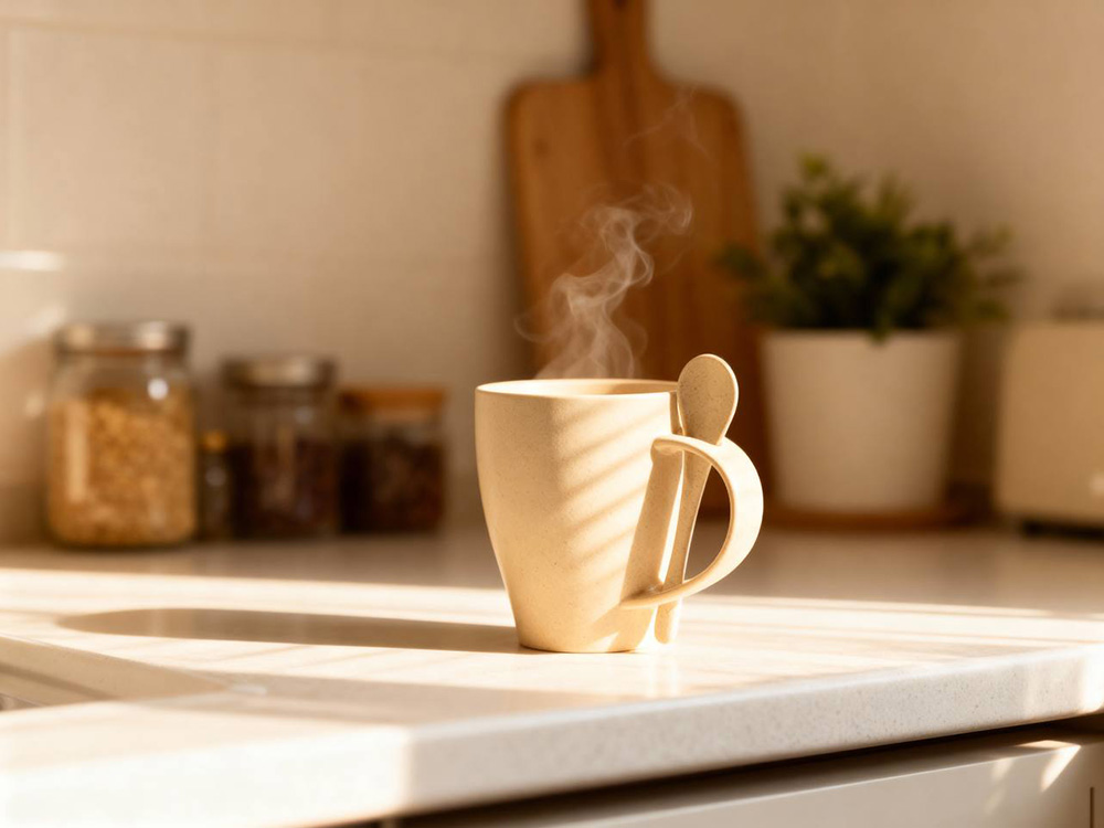 Кружка Nina состоит из смеси ПП-пластика (50%) и переработанной пшеницы (50%), что делает ее настоящим экомерчем. Поверхность кружки имеет приятный бежевый оттенок с небольшими вкраплениями-точками темно-серого цвета, которые только подчеркивают природное происхождение Nina.