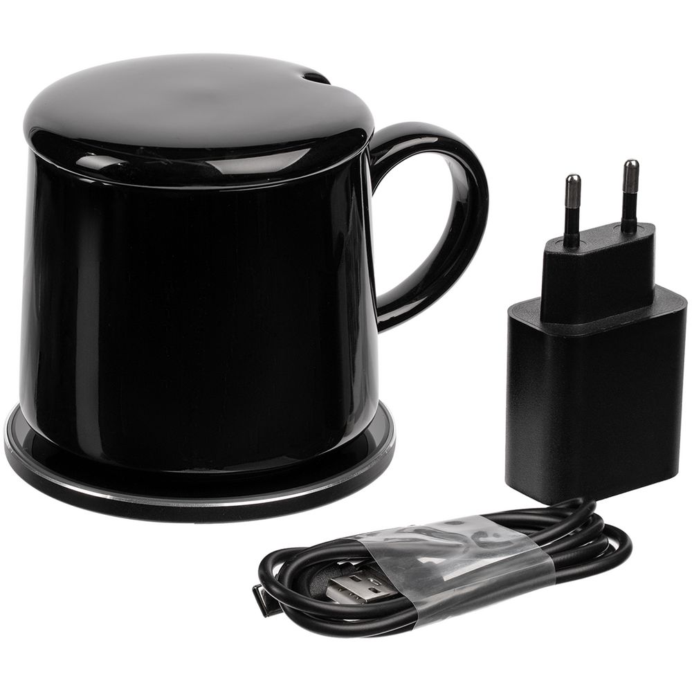 В комплект входит адаптер питания, база для зарядки и керамическая чашка, дно которой выполнено из специальных теплопроводящих материалов.
