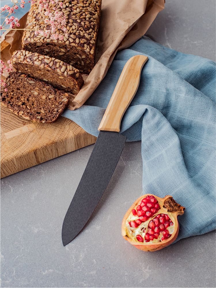 Нож Selva выполнен из керамики и бамбука. Широкий клинок имеет оптимальную форму и режущую кромку, которая не нуждается в заточке. Удобная анатомическая ручка ножа надежно лежит в руке, не скользит, практически не впитывает влагу.