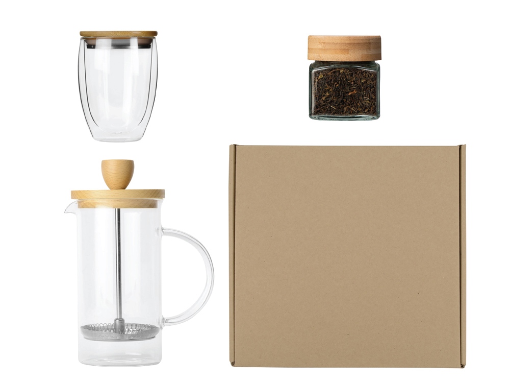 френч пресс - боросиликатное стекло, буковое дерево, нержавеющая сталь 304 марки, чай - банка -стекло, крышка- дерево, стакан - боросиликатное стекло, бамбук, нержавеющая сталь, коробка - картон