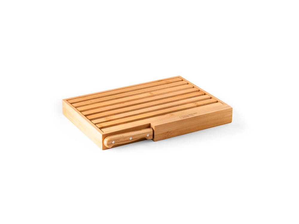 Хлебная доска из бамбука с ножом из нержавеющей стали в комплекте. Решетка снимается для легкого удаления крошек. Поставляется в подарочной коробке из крафт-бумаги. 350 x 250 x 40 мм