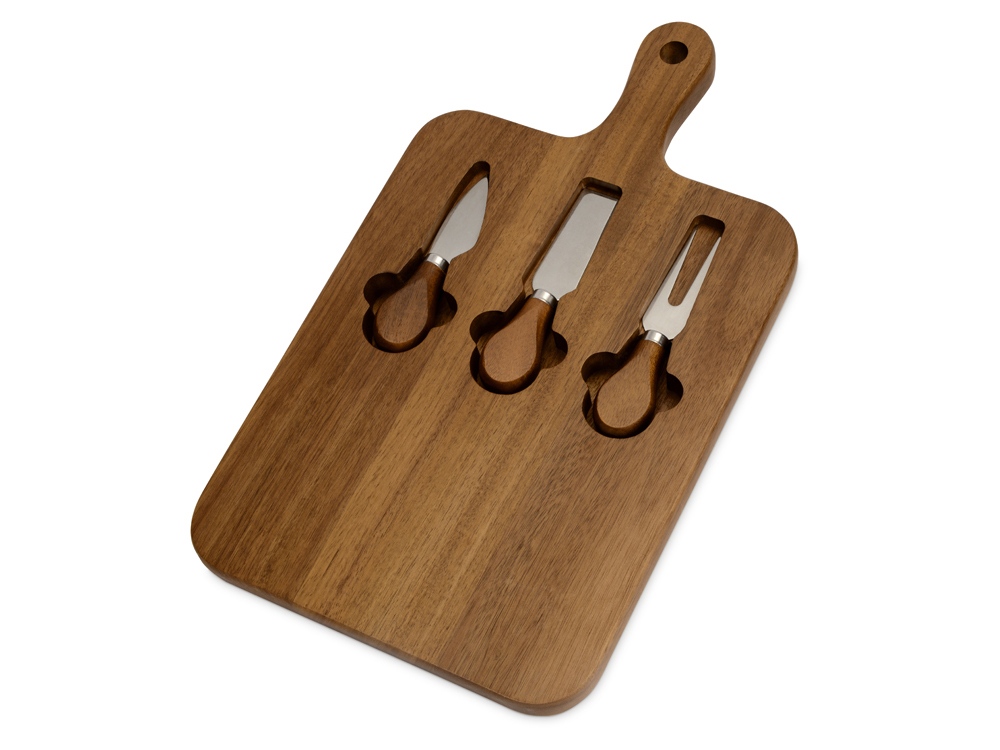 разделочная доска 21,5 х 37,3 х 2 см, нож листовидный 11,2 см, нож-лопатка для мягкого сыра 12,2 см, вилка 12,3 см