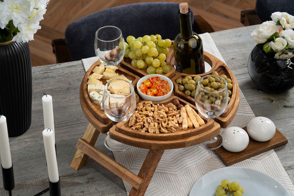 За винным столиком Chat Mode разговор польется приятно и легко, как и сам благородный напиток в бокалы. Компанию вину составит изысканная закуска, которую можно эстетично сервировать в менажницах на круглом подносе.