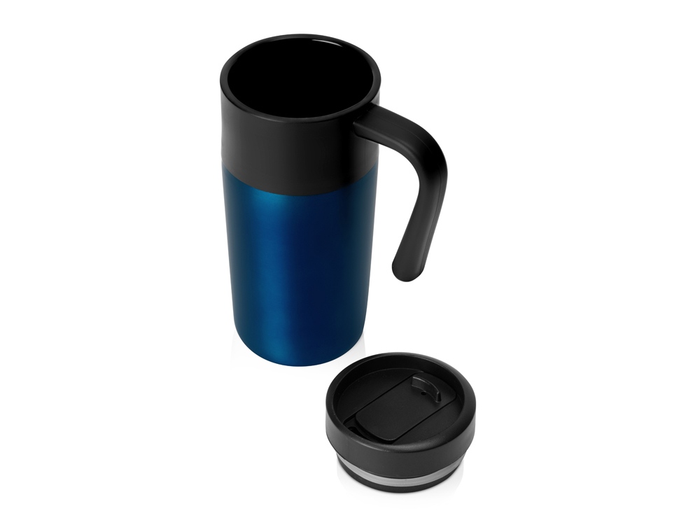 Термокружка с фиксированной ручкой и крышкой-слайдером. Внутренняя колба выполнена из безопасного полипропилена. Внешний корпус сделан из нержавеющей стали. Объем 330 мл.