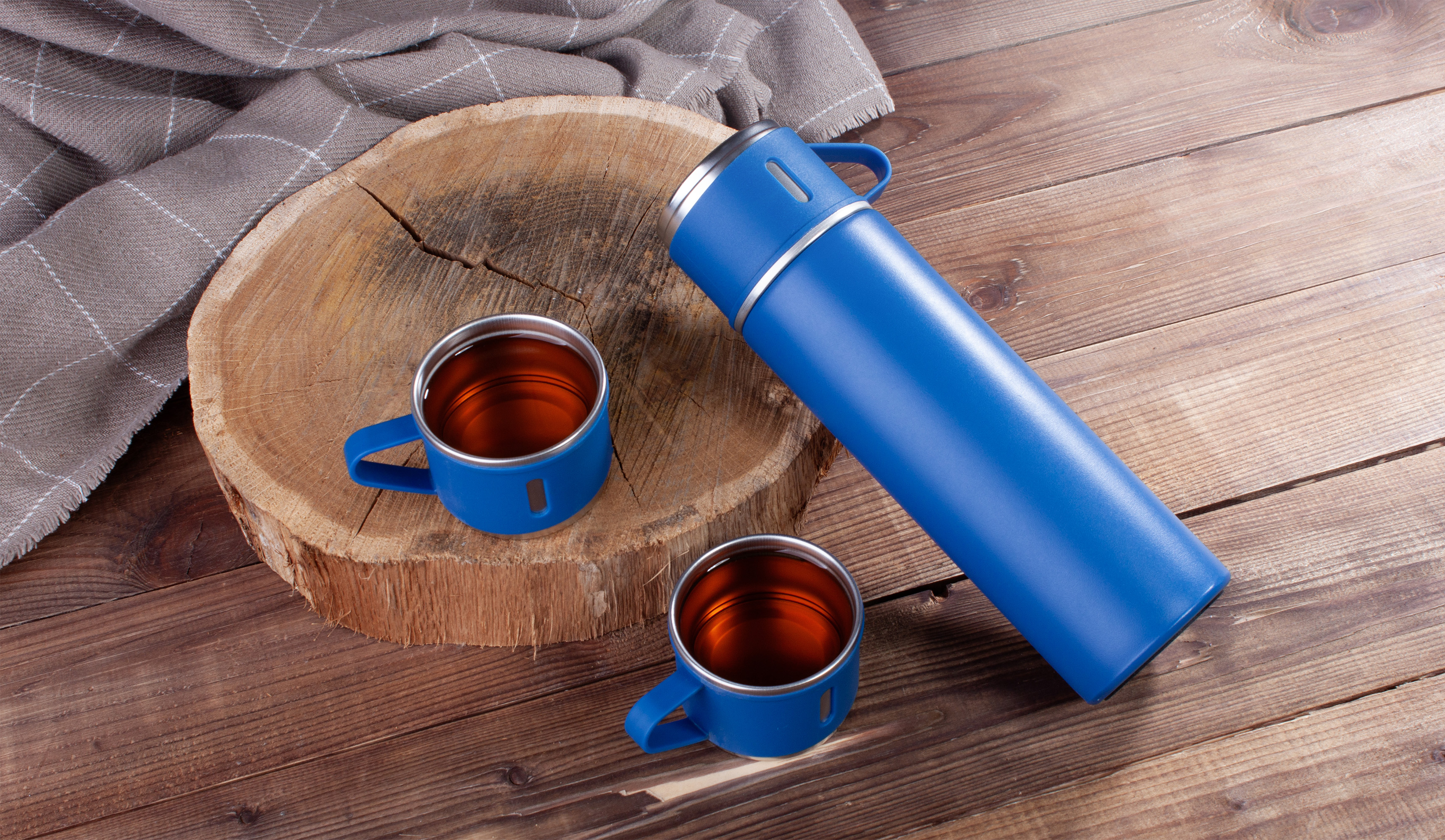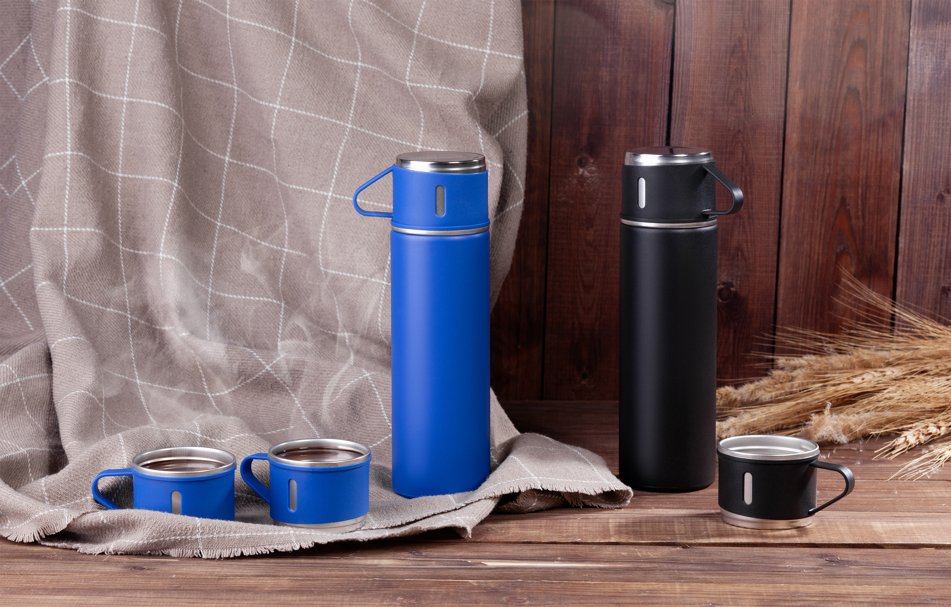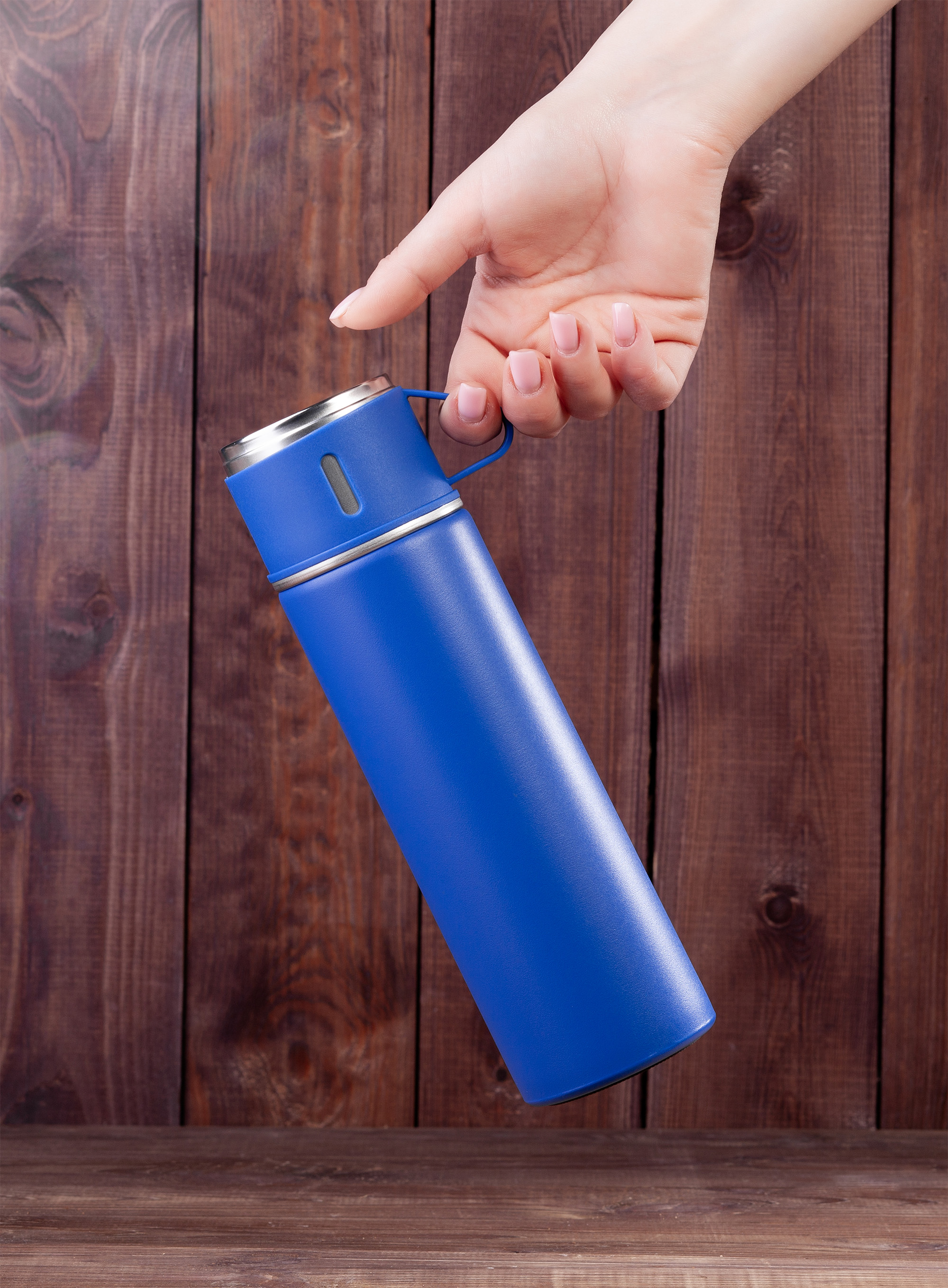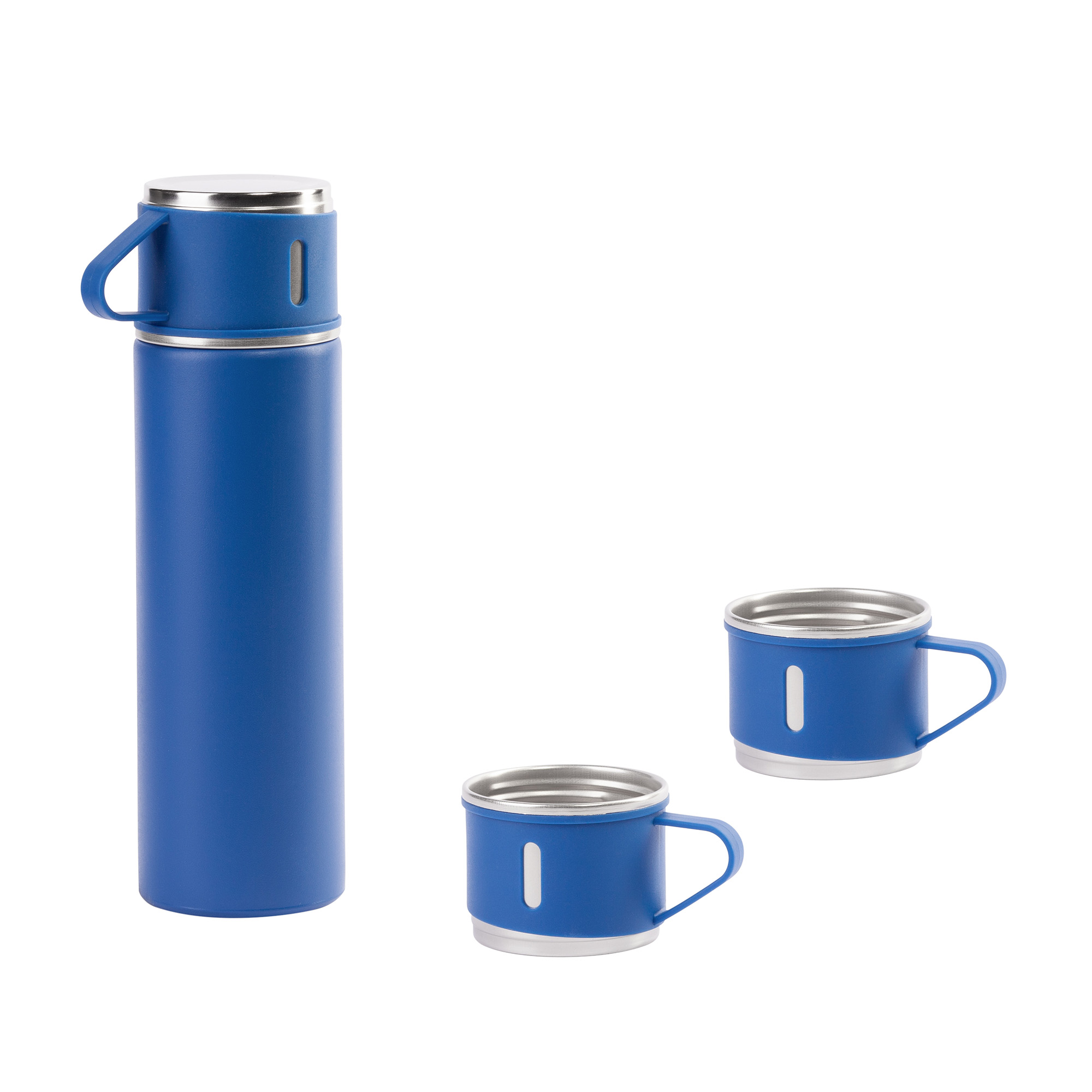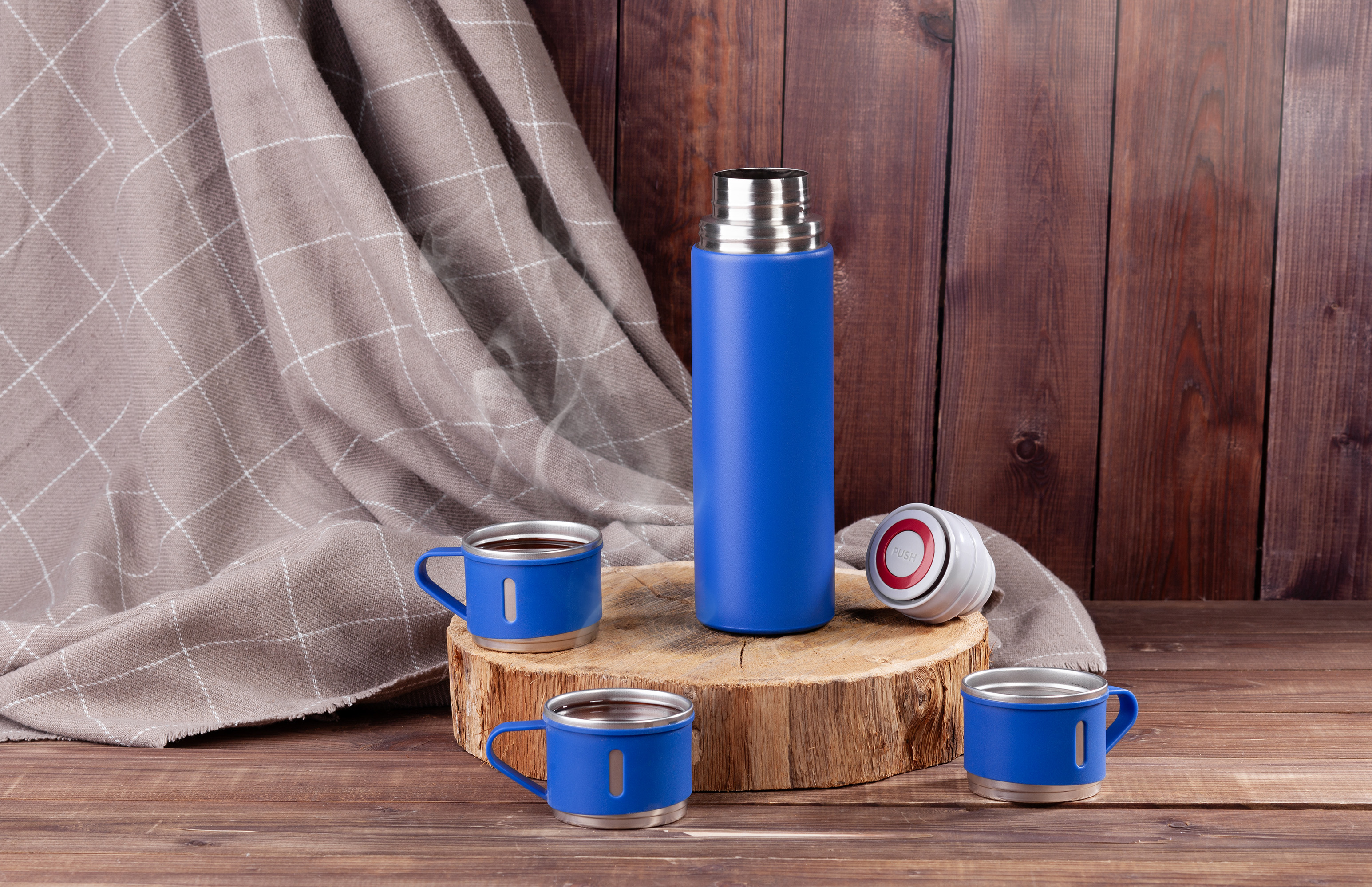 Набор подарочный "Алтай": термос, 3 кружки, покрытие пудра, синий