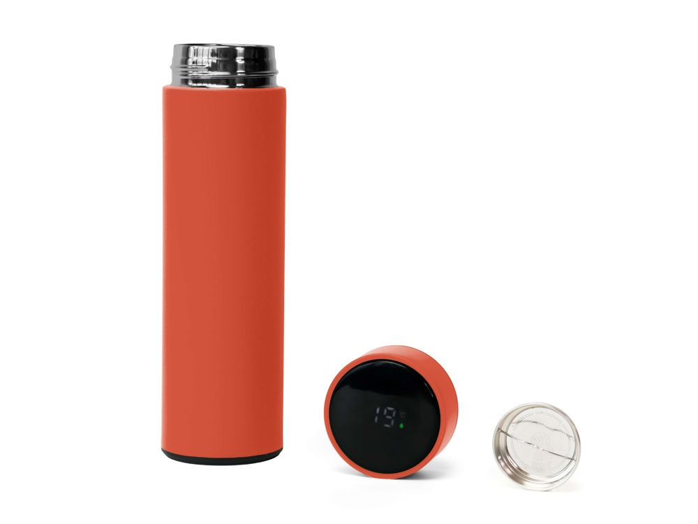 Термос из нержавеющей стали, покрытый цветным soft touch, с крышкой, в которой встроен термометр и LED дисплей, показывающий температуру внутри термоса. Объем: 500 мл. Упаковка: каждый термос в крафт коробке.