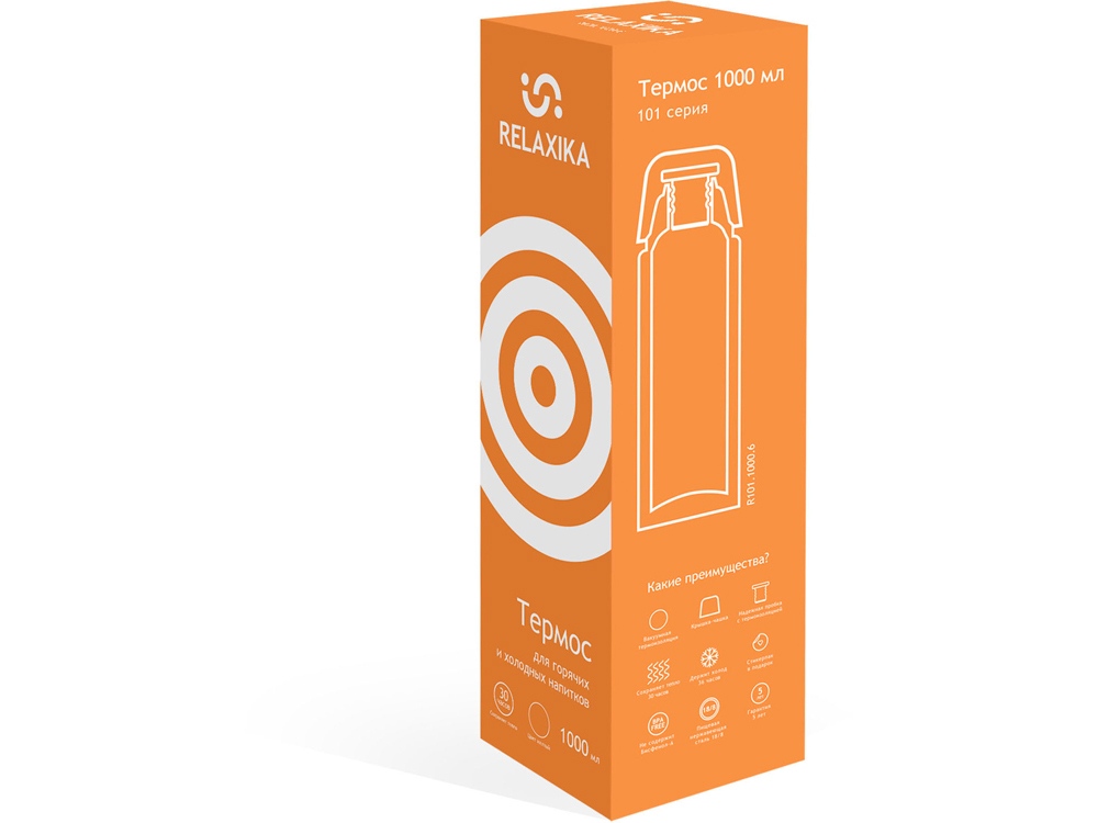 Классический термос Relaxika с высокими показателями удержания температуры напитка для походов, путешествий, спорта и ежедневного использования. Прочные двойные стенки из высококачественной нержавеющей стали 18/8 с вакуумной изоляцией гарантируют, что ваш напиток останется холодным в течение 36 часов и горячим до 30 часов. Этот материал не только прочен, но и гигиеничен, не выделяет никаких вредных для здоровья веществ. Ваши напитки сохраняет естественный вкус и не приобретут посторонний запах. Напиток остается холодным до 36 часов и горячим до 30 часов.