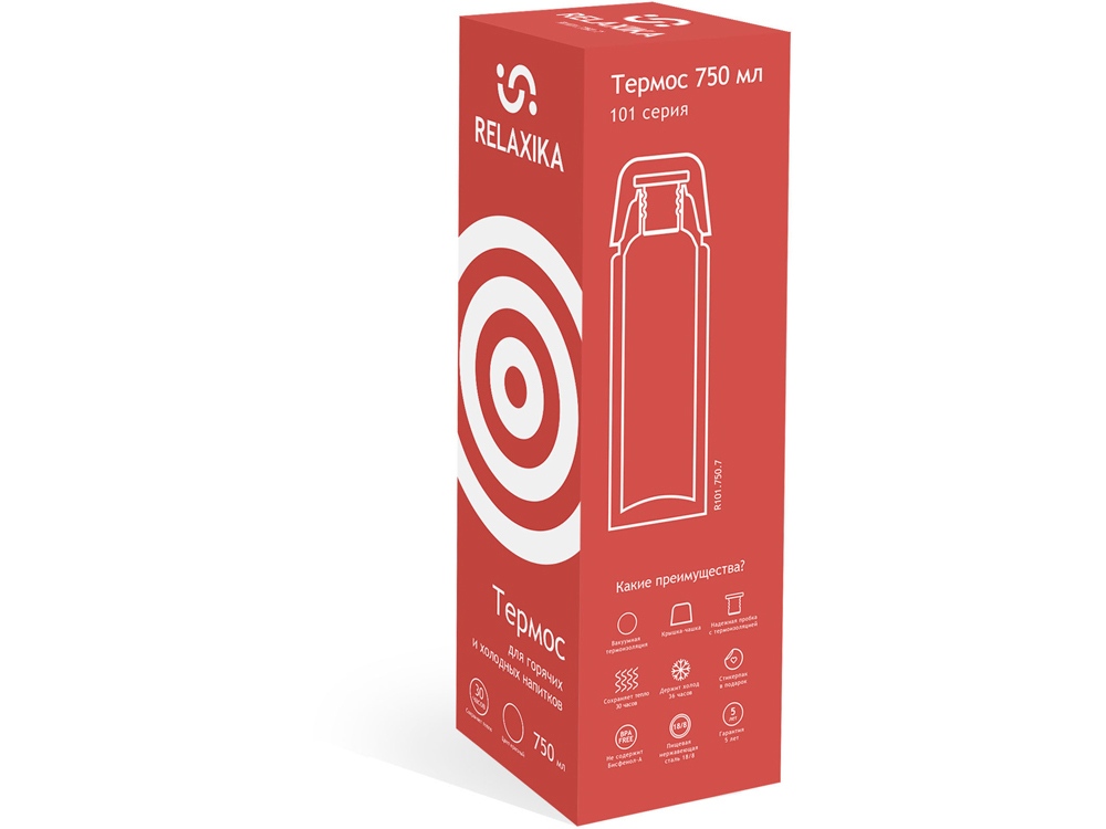 Классический термос Relaxika с высокими показателями удержания температуры напитка для походов, путешествий, спорта и ежедневного использования. Прочные двойные стенки из высококачественной нержавеющей стали 18/8 с вакуумной изоляцией гарантируют, что ваш напиток останется холодным в течение 36 часов и горячим до 30 часов. Этот материал не только прочен, но и гигиеничен, не выделяет никаких вредных для здоровья веществ. Ваши напитки сохраняет естественный вкус и не приобретут посторонний запах. Напиток остается холодным до 36 часов и горячим до 30 часов.