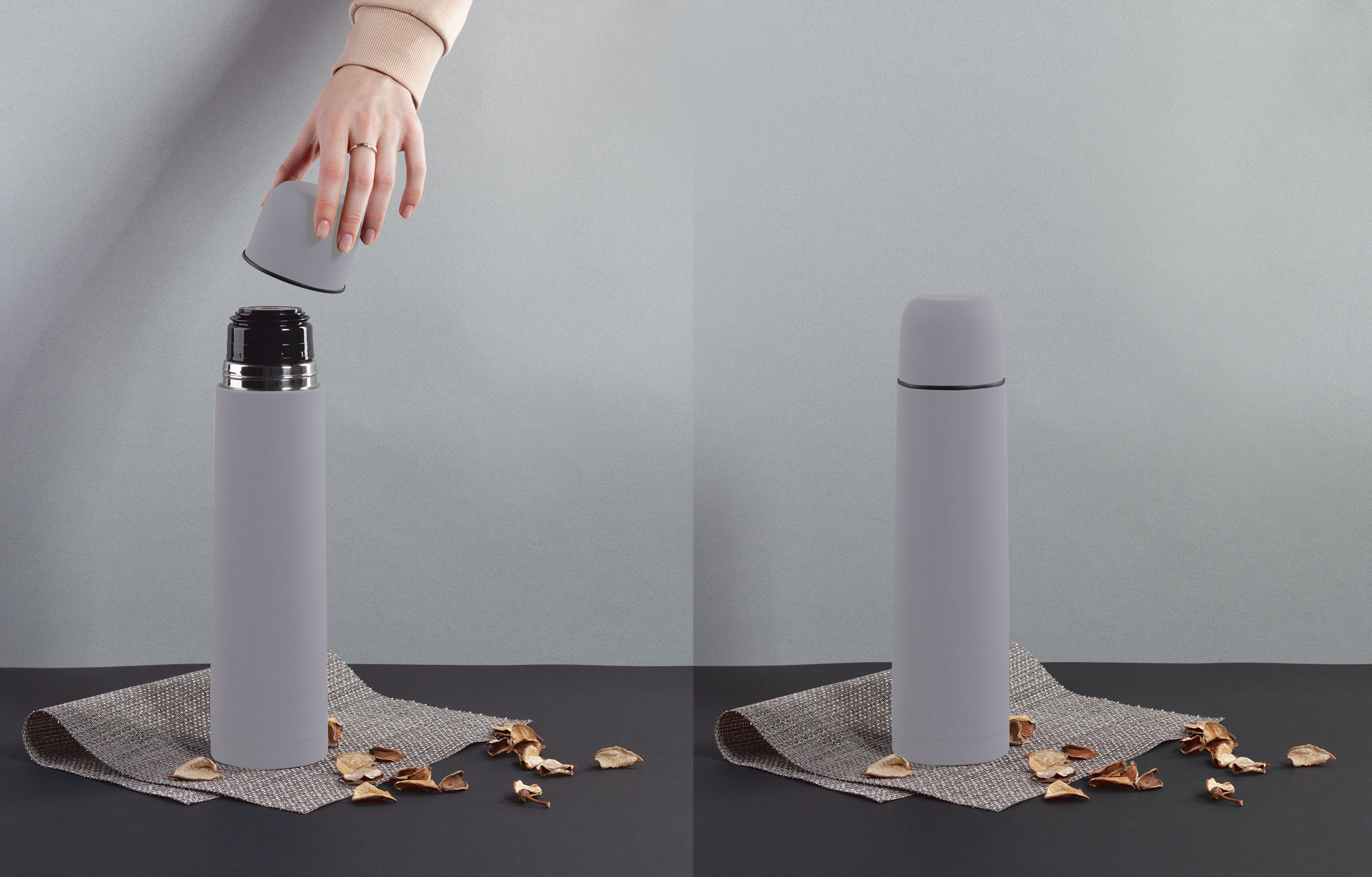 Внешняя стенка термостакана изготовлена из нержавеющей стали с уникальным прорезиненным напылением soft-touch, а внутренняя стенка выполнена из  высококачественной пищевой, нержавеющей стали. Корпус изделия персонализируется по окружности встык. Термос оснащен пробкой с клапаном, которая позволяет наливать напиток одним нажатием.