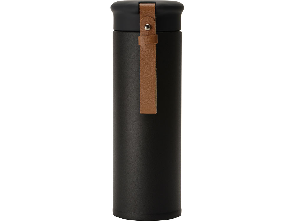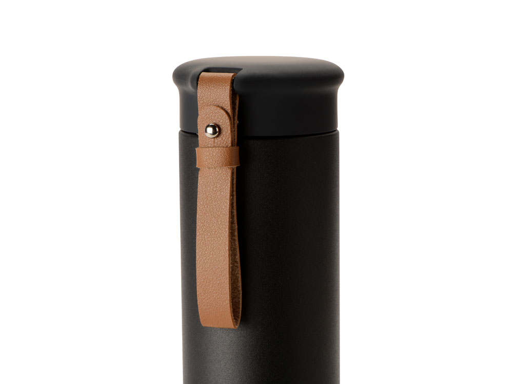 Термос герметично завинчивается на крышку, оснащенную съемным ремешком из качественной ПУ кожи. Крышка имеет прорезиненное покрытие, что создает интересное сочетание текстур в рамках одной модели. Корпус имеет элегантную рельефную поверхность с антискользящим эффектом.