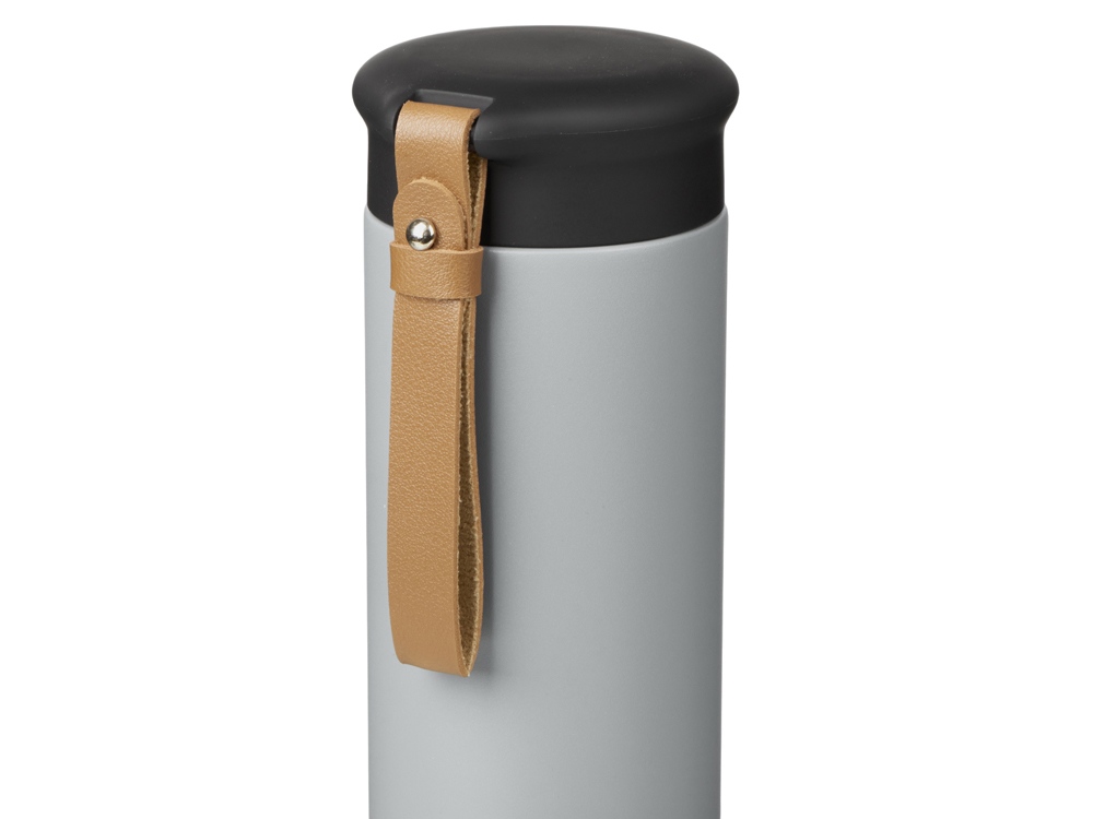 Термос герметично завинчивается на крышку, оснащенную съемным ремешком из качественной ПУ кожи. Крышка имеет прорезиненное покрытие, что создает интересное сочетание текстур в рамках одной модели. Корпус имеет элегантную рельефную поверхность с антискользящим эффектом.