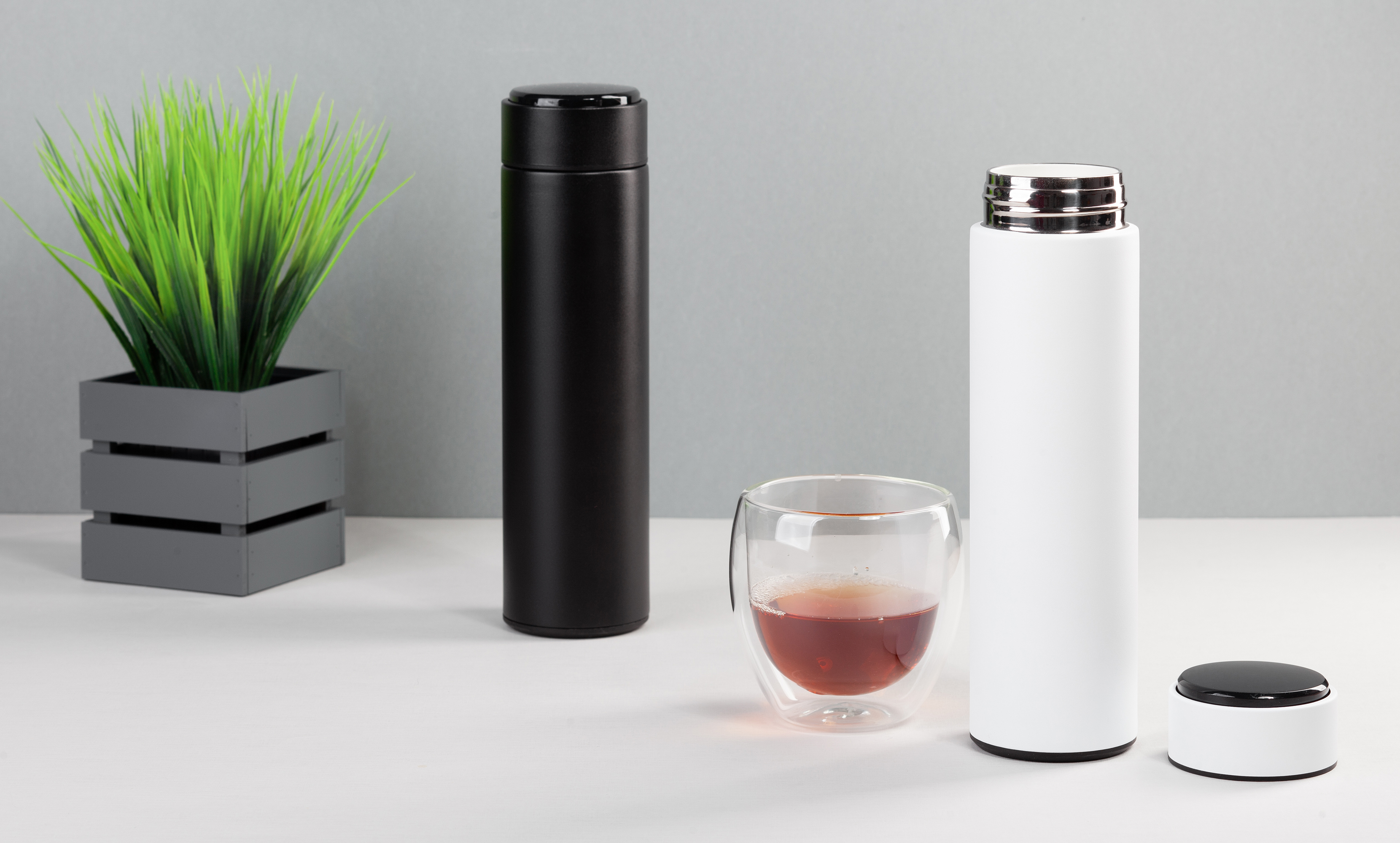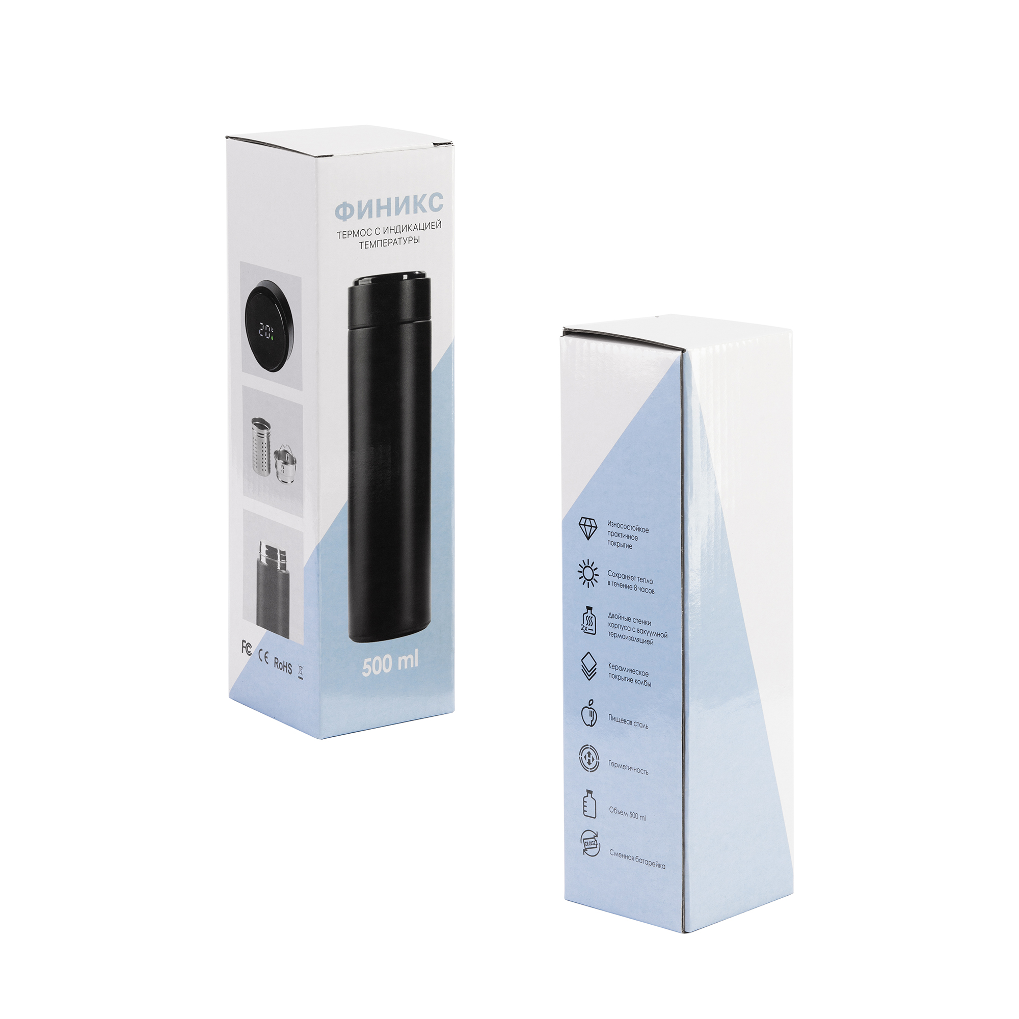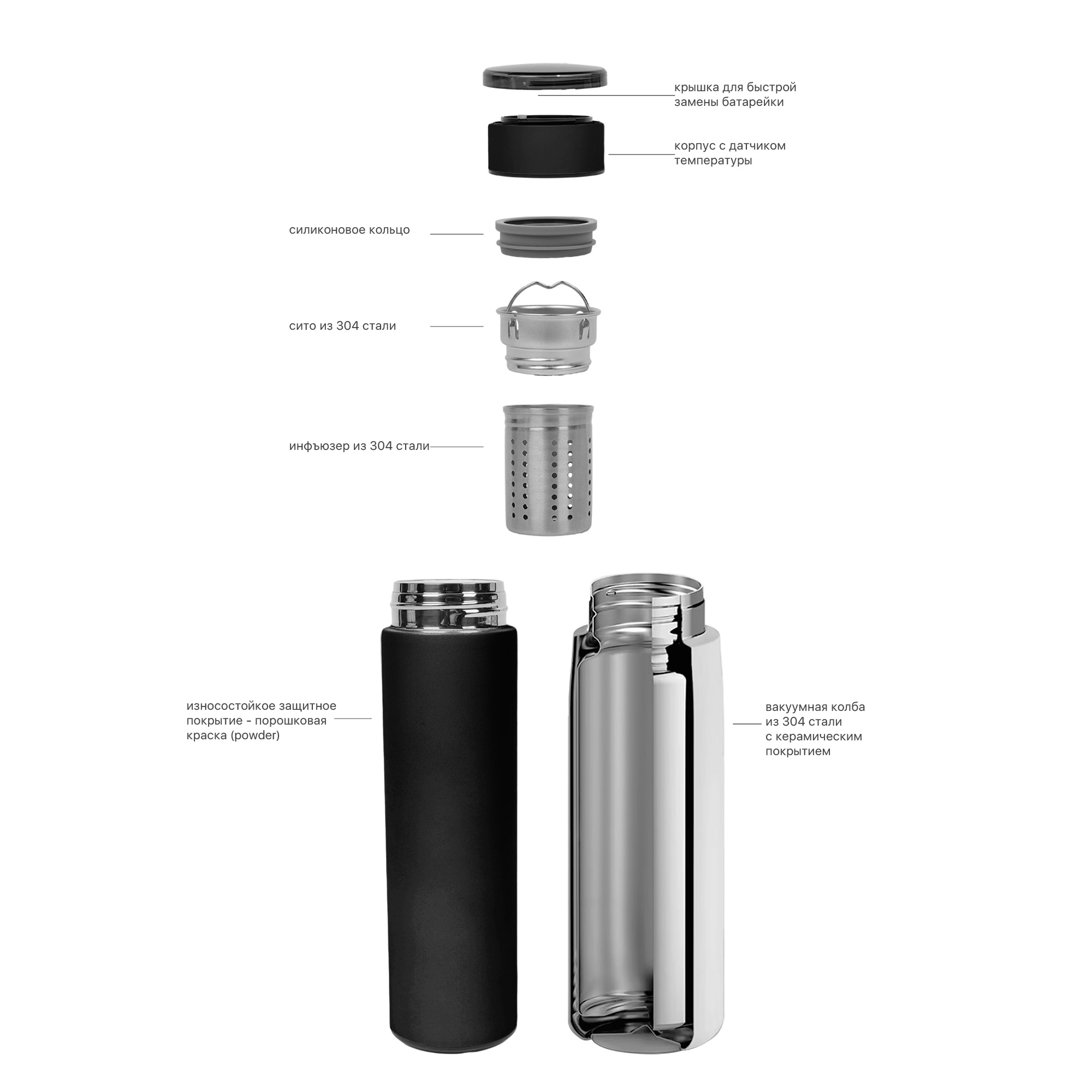 Финикс - новый эталон практичности. Новинка получила керамическое покрытие колбы. Белая керамика защищает напиток от контакта с металлом, благодаря этому он дольше сохраняет свежесть и полезные свойства. В комплекте инфузер для заваривания чая или кофе. Крышка с индикацией разборная, батарейку (тип CR2032) можно легко заменить.
