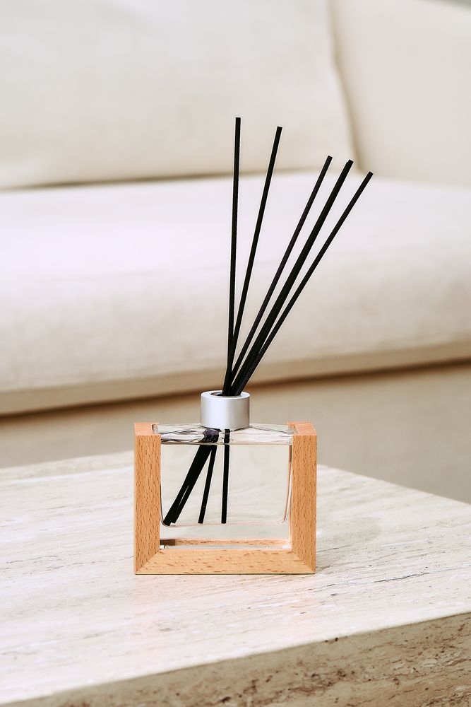 Изящный стеклянный флакон в обрамлении натурального дерева станет стильным элементом декора.