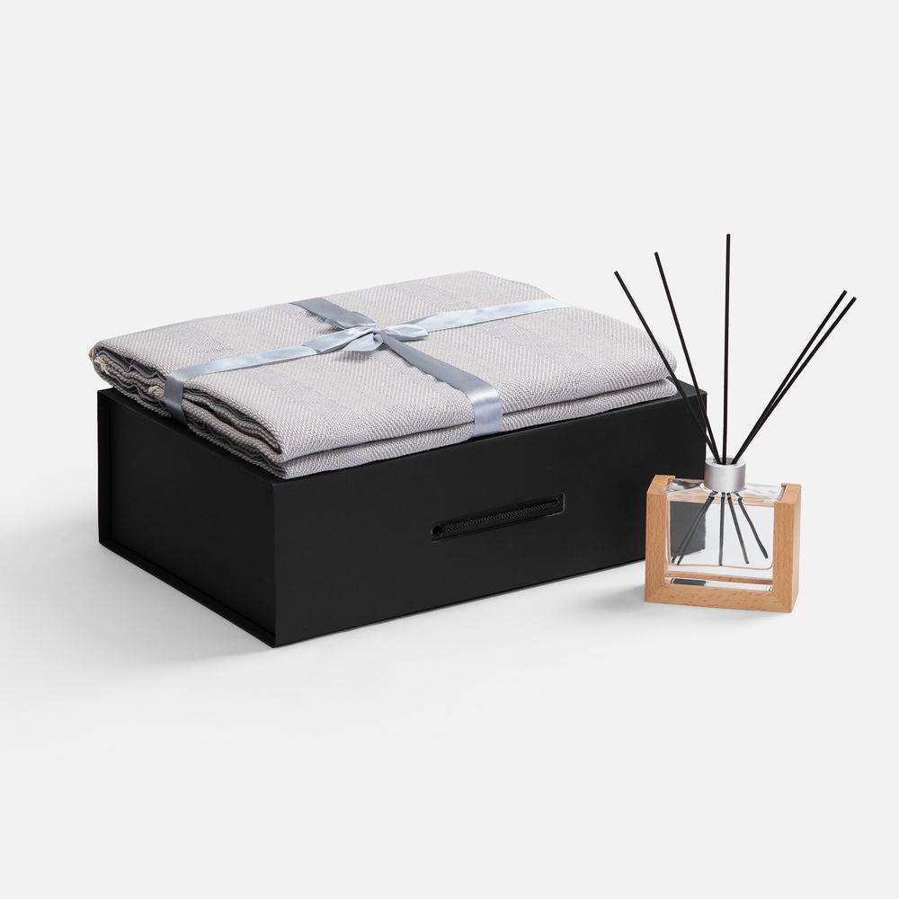 дерево, коробка - переплетный картон, бумага Malmero, переплетный картон, плед - хлопок 95%, полиэстер 5%, плотность 300 г/м², подставка для флакона - дерево, стекло, флакон - стекло, палочки из файбера, хлопок 95%
