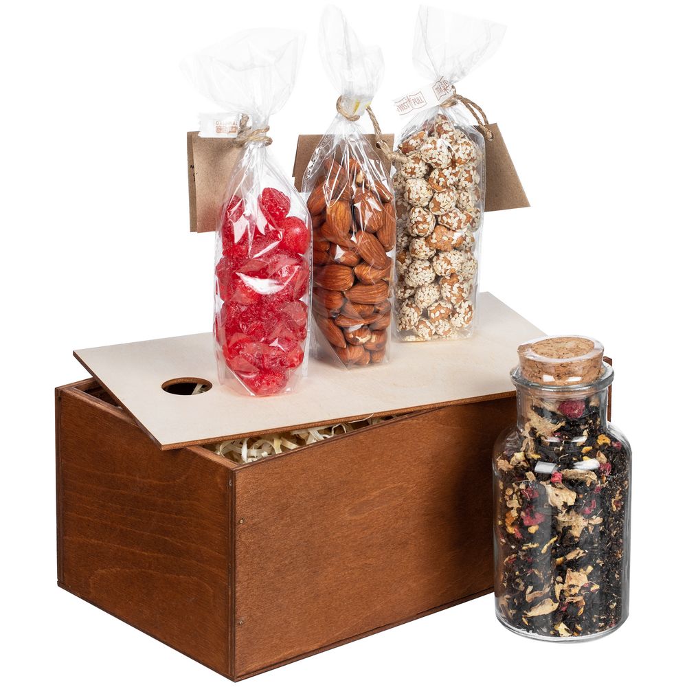 арахис, вишня, миндаль - полиэтилен, дерево, полиэтилен, стекло, чай - стекло, пробка, ящик, наполнитель - дерево