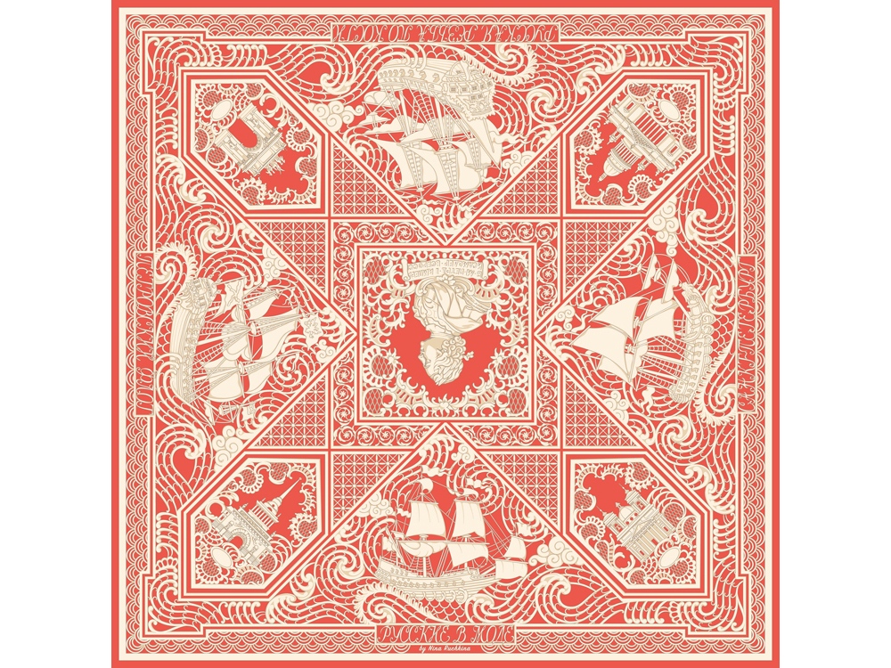 Тематика платка - Петровский Флот. В центре - декоративная резная пластина в пышном обрамлении с профилем великого русского самодержца Петра I.