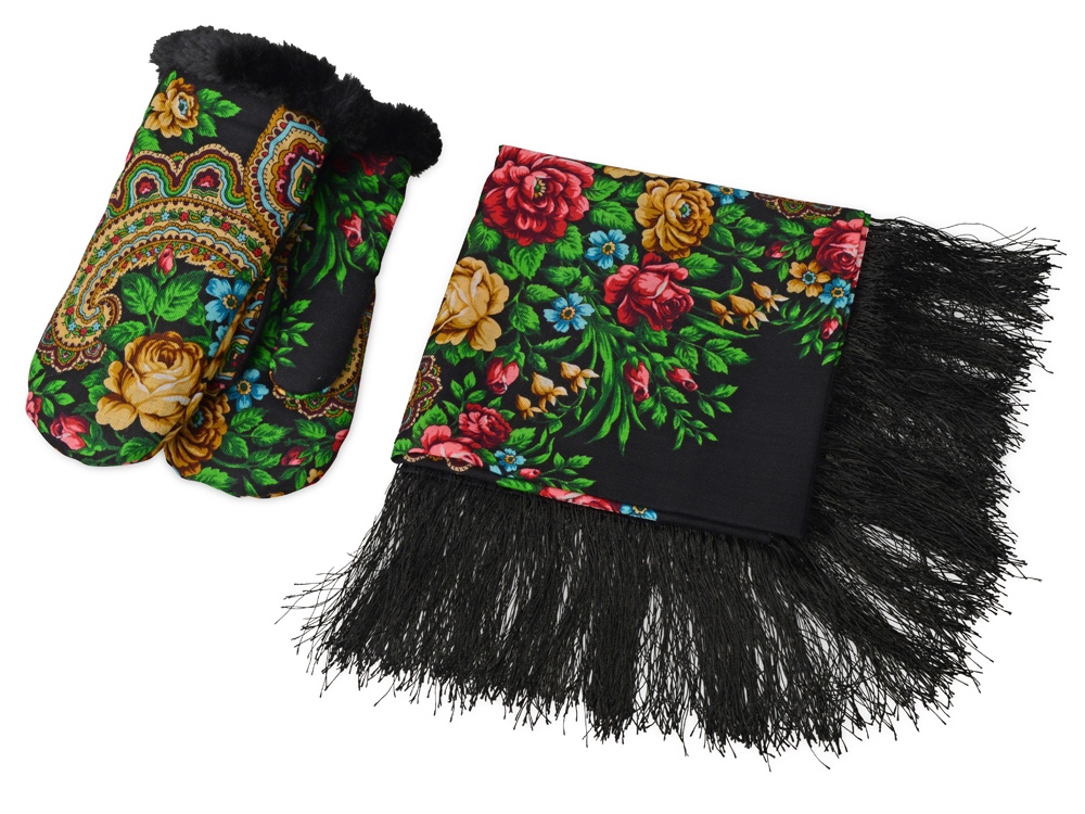 Великолепный подарок для женщин, ценящих русскую культуру. Набор состоит из настоящего Павлопосадского шерстяного платка и рукавиц с отделкой из искусственного меха. Аксессуары украшены роскошным орнаментом. Шильд спектрум (Шильд спектрум) на данный товар осуществляется бесплатно. Оплачивается только настройка оборудования в размере 1000 рублей на весь тираж.