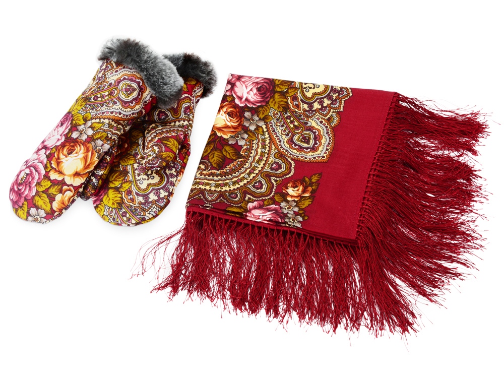 Набор: Павлопосадский платок, рукавицы, красный/разноцветный