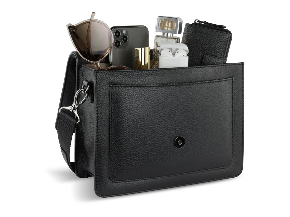 Функциональная организация: основное отделение на магнитной кнопке с карманом на молнии, передний открытый карман, задний карман на молнии, съемный регулируемый плечевой ремень (до 130 см).