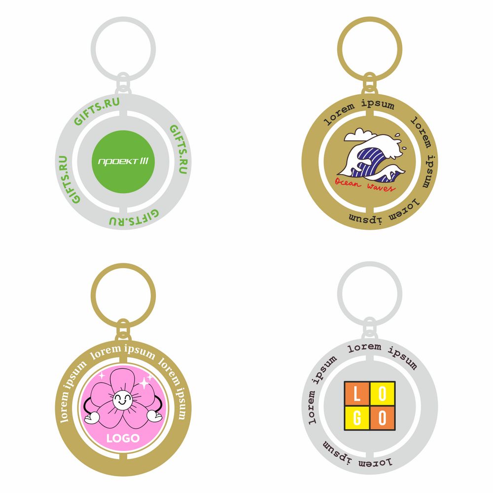 В стоимость входит изготовление брелка с двусторонним 2D-изображением на внутренней (вращающейся) и внешней части с заливкой мягкой эмалью в три цвета.