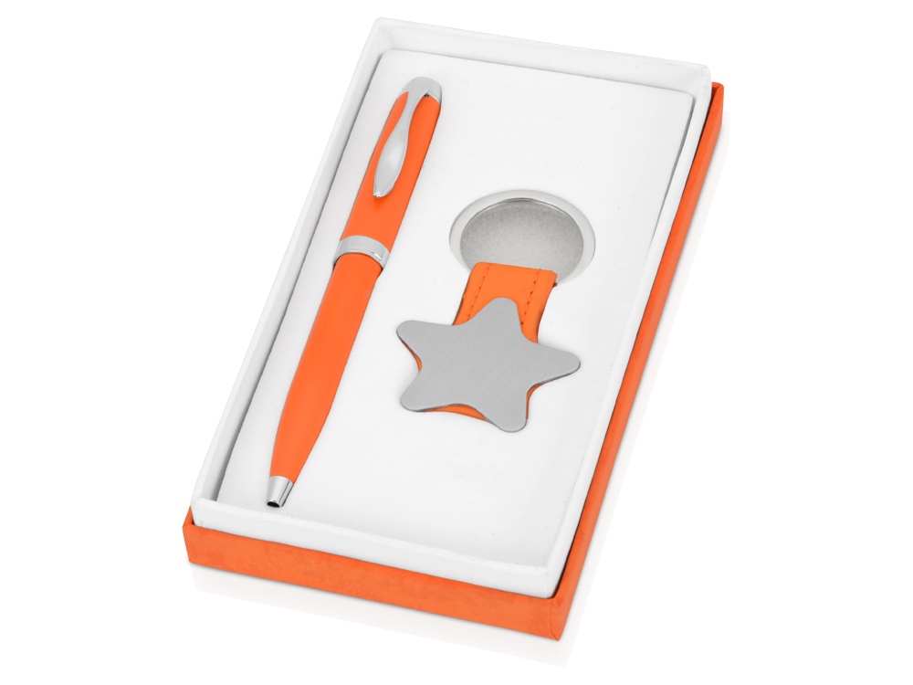 Набор включает в себя шариковую ручку и оригинальный брелок в форме звезды. Набор может стать своеобразной наградой для лучших сотрудников фирмы по итогам года. Гравировка (оптоволоконный лазер) (Без чернения) на данный товар осуществляется бесплатно. Оплачивается только настройка оборудования в размере 1000 рублей на весь тираж.