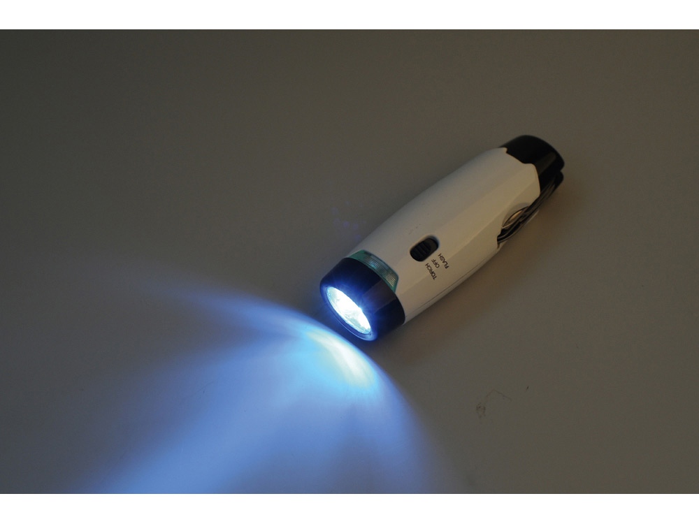 Замечательный фонарик-мультиинструмент дает яркий световой поток синего и красного цветов. Фонарик станет прекрасным и незаменимым помощником во время похода. Тампопечать (1 цвет (белые изделия)) на данный товар осуществляется бесплатно. Оплачивается только настройка оборудования в размере 4000 рублей на весь тираж.