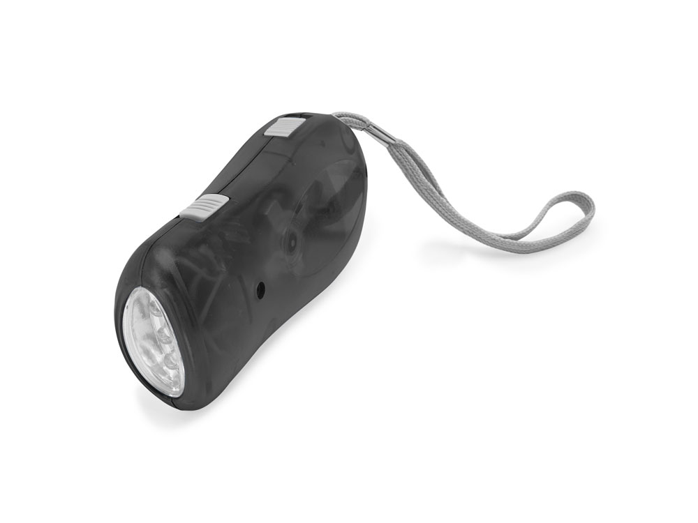 Фонарик с 3 светодиодами и динамо-зарядкой. Доступен в различных полупрозрачных цветах, с серым ремешком для переноски
