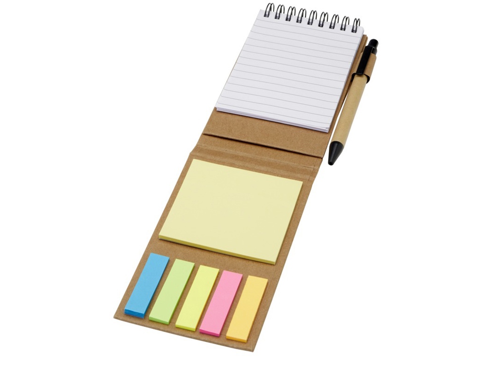 Липкий блокнот с шариковой ручкой. В блокноте 30 листов белой линованной бумаги плотностью 70 г/м2 (8 x 12 см). В комплект также входят 25 разноцветных (5 x 1,2 см) и 25 желтых (7,5 x 7,5 см) клейких листочков, оба типа на бумаге плотностью 70 г/м2. Корпус шариковой ручки изготовлен из переработанной бумаги. Цвет чернил: черный. Длина непрерывной линии: 1000 метров. Размер пера: 1,00 мм.