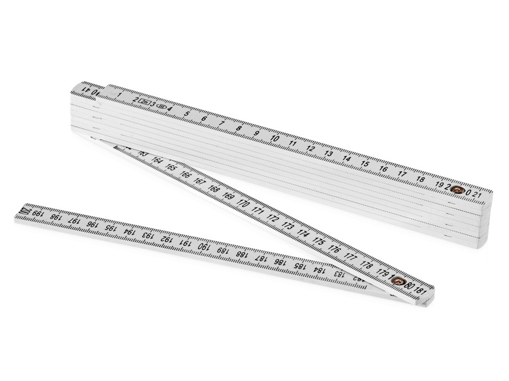Складная линейка длиной 2 м. Двусторонняя линейка со шкалой на 200 см с одной стороны и 79 дюймов с другой. Линейка состоит из нескольких складных частей. АБС-пластик. На боковую часть можно нанести логотип компании.