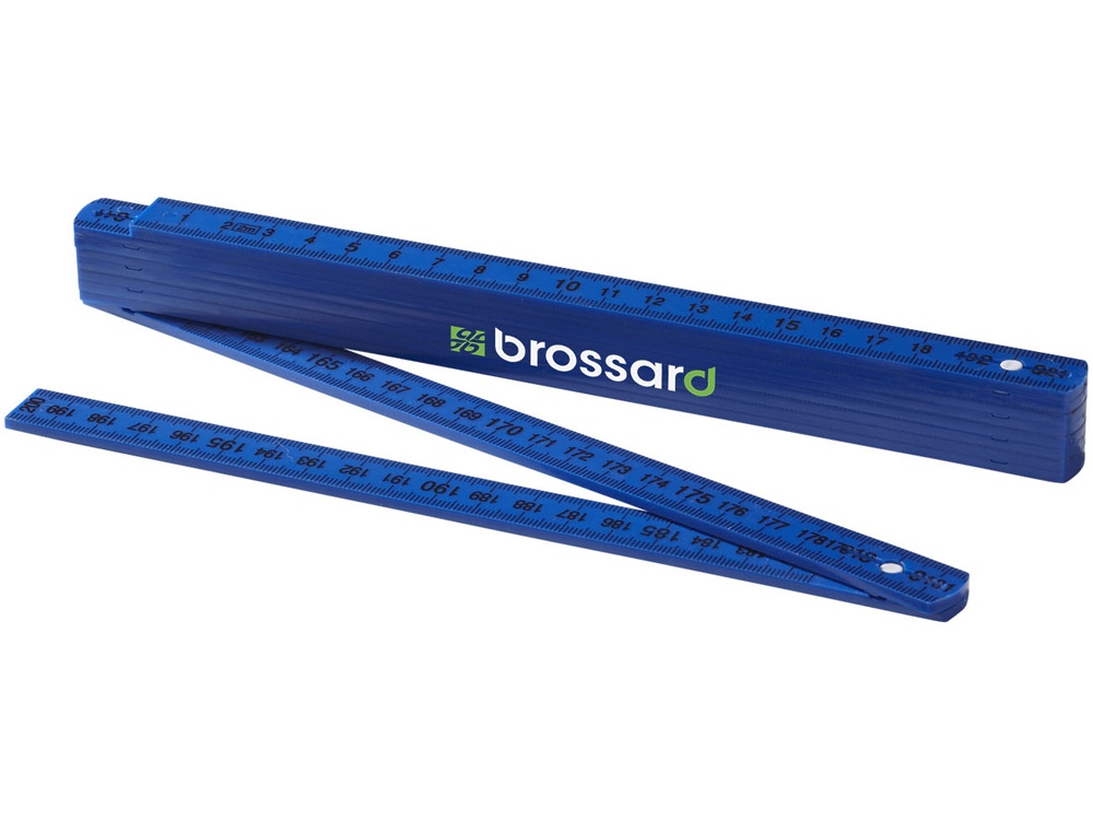 Складная линейка длиной 2 м. Двусторонняя линейка со шкалой на 200 см с одной стороны и 79 дюймов с другой. Линейка состоит из нескольких складных частей. АБС-пластик. На боковую часть можно нанести логотип компании.