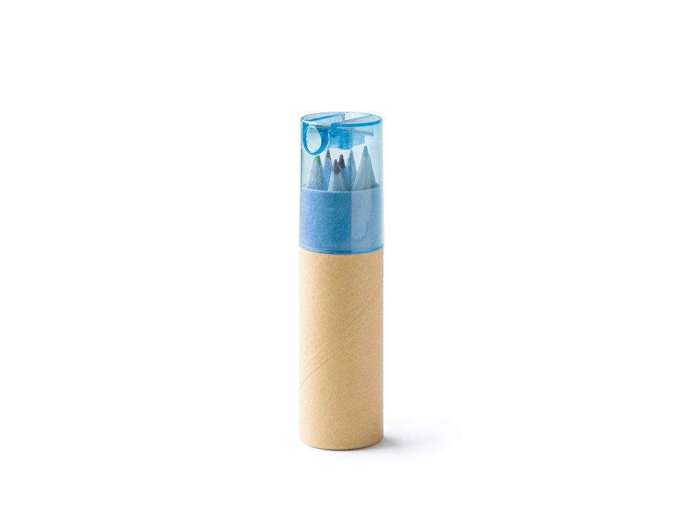 Набор из 6 деревянных карандашей в футляре из переработанного картона с полупрозрачной цветной крышкой. В крышку встроена точилка для карандашей. Доступен в различных цветах.