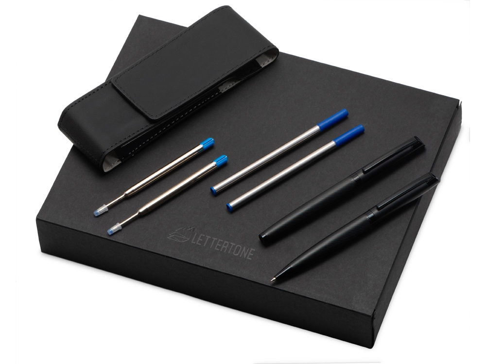 В набор входят шариковая ручка и роллер. Швейцарский пишущий узел Premec и немецкие чернила Dokumental обеспечивают мягкое и плавное письмо. Корпус каждой ручки имеет анодированный слой, благодаря которому гравировка получается с зеркальным эффектом.В набор входит также пенал для двух ручек, который также можно брендировать.