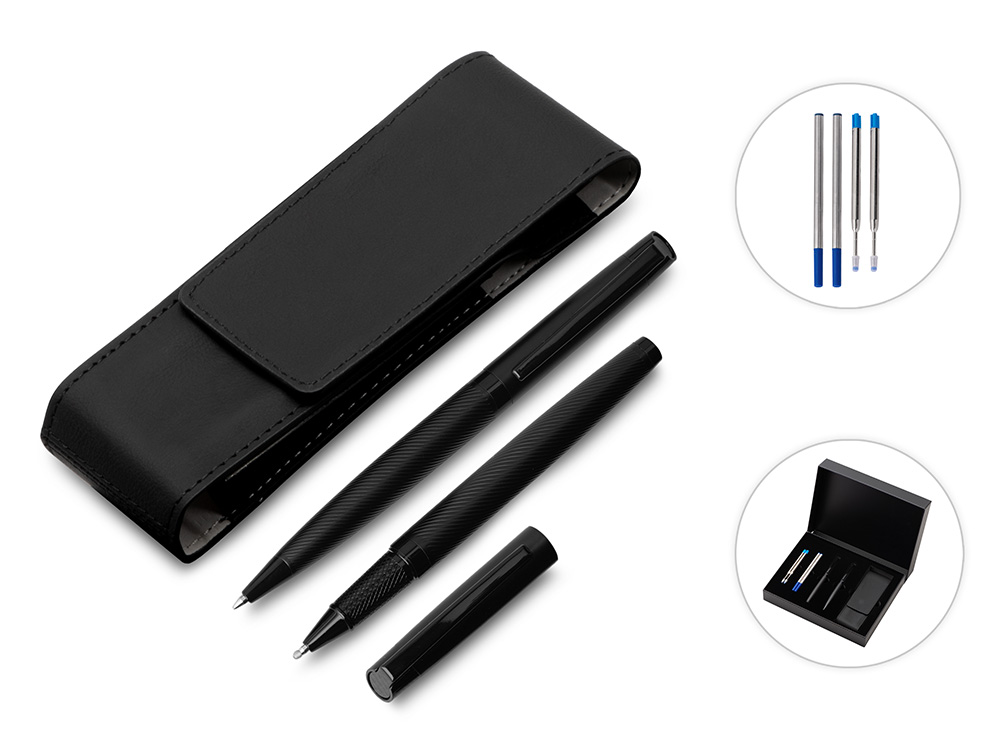 В набор входят шариковая ручка и роллер. Швейцарский пишущий узел Premec и немецкие чернила Dokumental обеспечивают мягкое и плавное письмо. Корпус каждой ручки имеет анодированный слой, благодаря которому гравировка получается с зеркальным эффектом.В набор входит также пенал для двух ручек, который также можно брендировать.