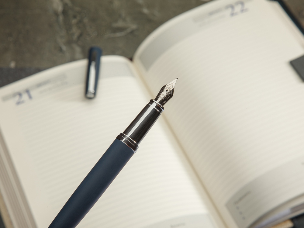 Cтильная перьевая ручка Sienna от Bruno Visconti синего цвета с контрастирующими элементами в цвет серебра. Благодаря покрытию Soft Touch пальцы не скользят по корпусу ручки, письмо комфортное и легкое. Ручка оснащена высококачественным механизмом подачи чернил, благодаря которому линия остается однородной и аккуратной. Чернила не токсичны, на основе водорастворимого красителя, не забивают фидер. Перьевой наконечник выполнен из иридиума и дополнен орнаментом.