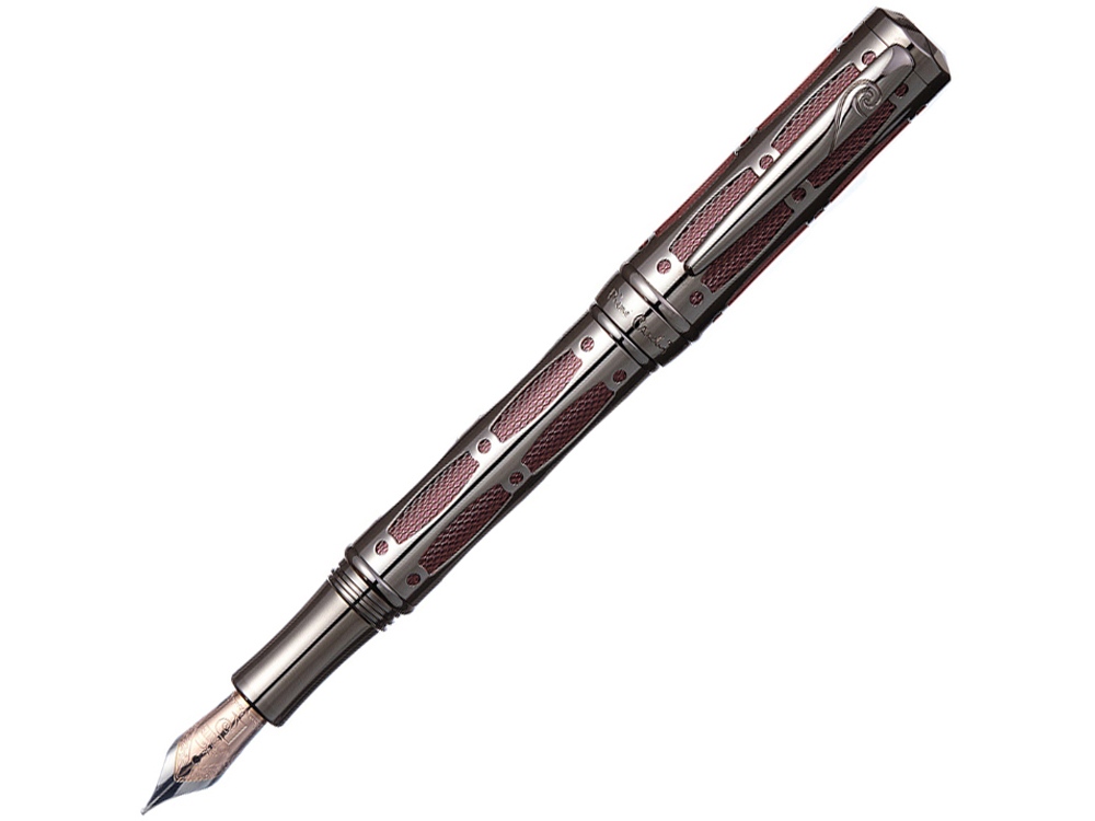 Ручка перьевая Pierre Cardin THE ONE с колпачком на резьбе. Отделка и детали дизайна - фигурная оправа корпуса из пушечной стали, гравировка гильош. Перо - BOCK, нержавеющая сталь с позолотой, среднее.