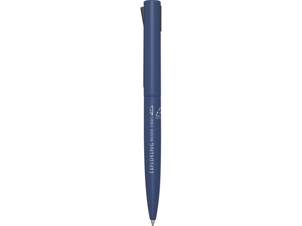 Шариковая ручка, верхняя часть корпуса которой изготовлена из переработанного пластика, а нижняя часть — из переработанного алюминия. Зажим изготовлен из железа. Цвет чернил: синий. Длина непрерывной линии: 1000 метров. Размер пера: 1,0 мм. Recycled Aluminium.