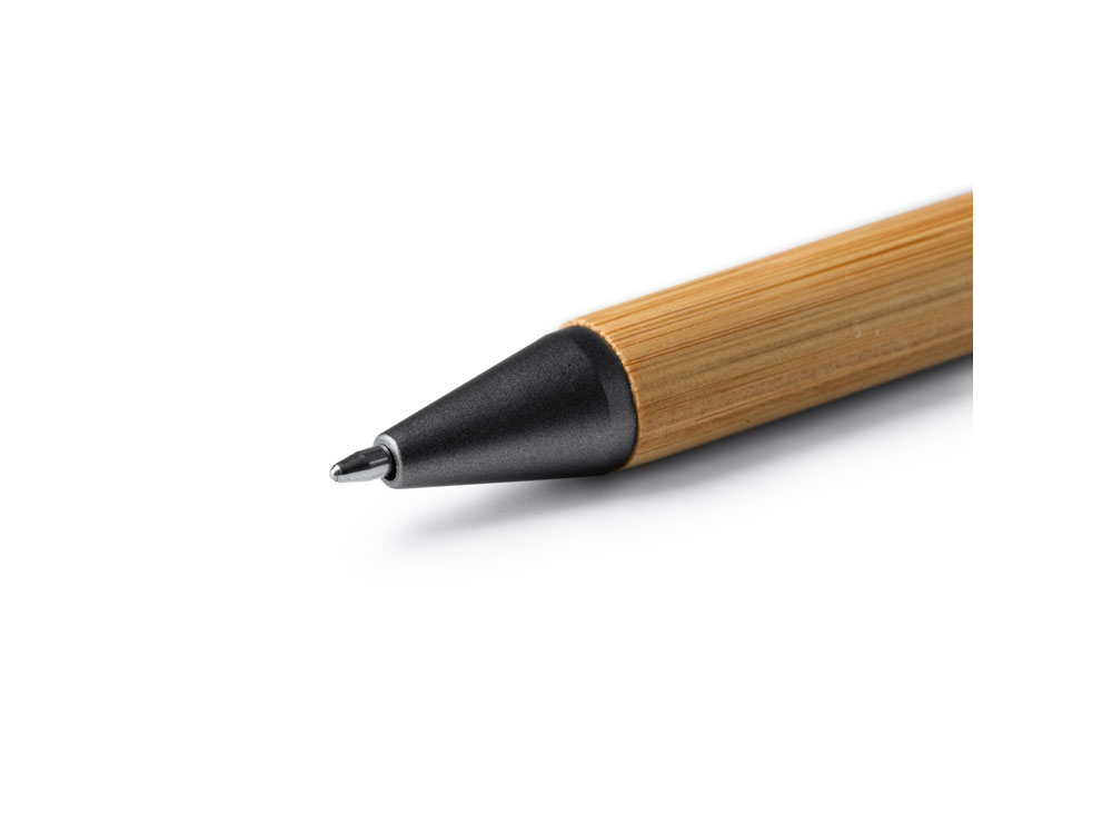 Металлическая шариковая ручка с матовым покрытием, бамбуковой вставкой и деталями темного цвета.