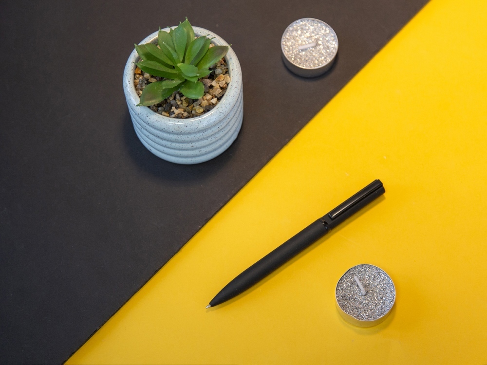 Эта металлическая ручка имеет очень необычную интересную форму — верхняя часть (до поворотного механизма) уже, чем нижняя. За счёт покрытия софт-тач ручка очень приятна на ощупь. При гравировке вскрывается серебристый слой.