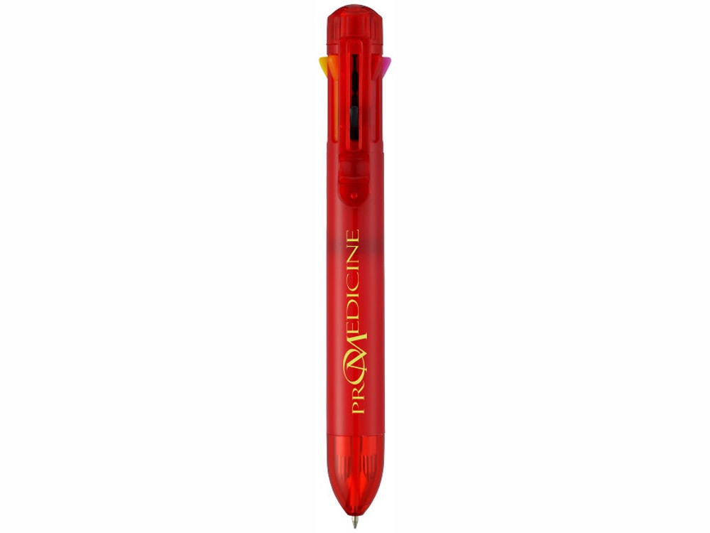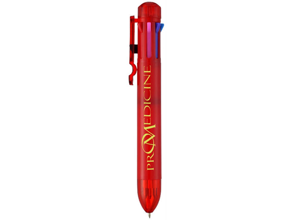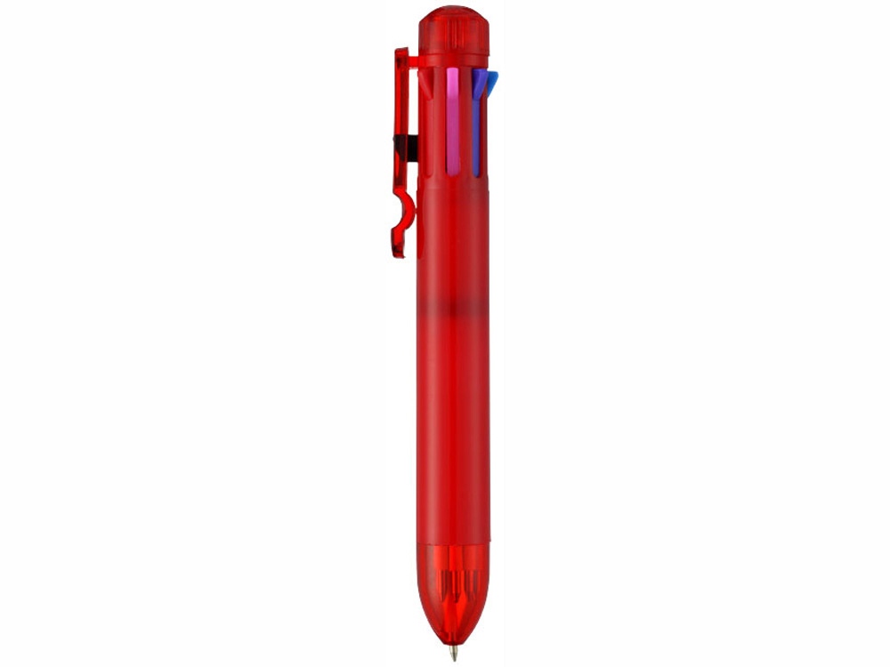Многостержневая шариковая ручка с кнопочным механизмом и стержнями 8 различных цветов: черным, синим, зеленым, оранжевым, розовым, фиолетовым, красным и желтым.