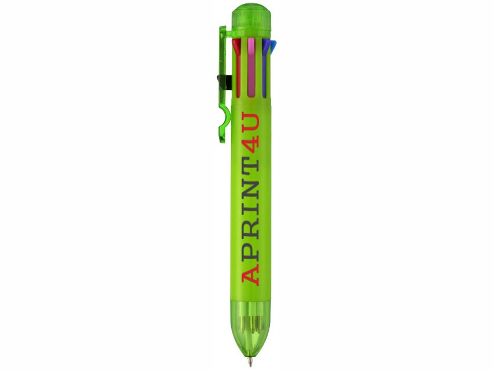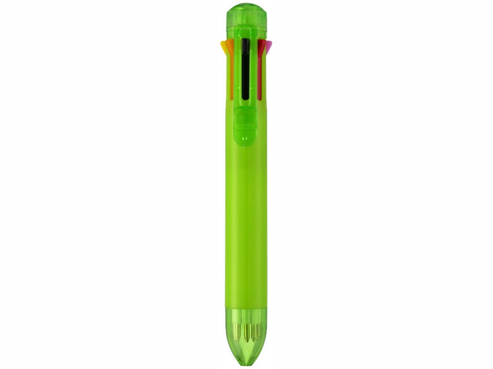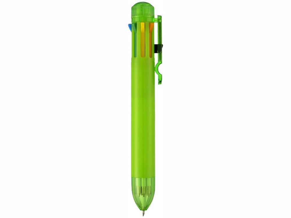 Многостержневая шариковая ручка с кнопочным механизмом и стержнями 8 различных цветов: черным, синим, зеленым, оранжевым, розовым, фиолетовым, красным и желтым.