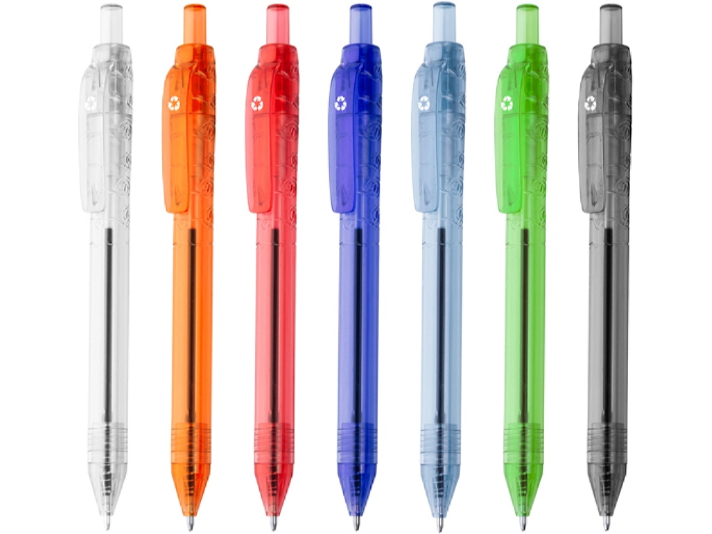 Полупрозрачная дизайнерская ручка из материала RPET. Кнопочный механизм. Синие чернила