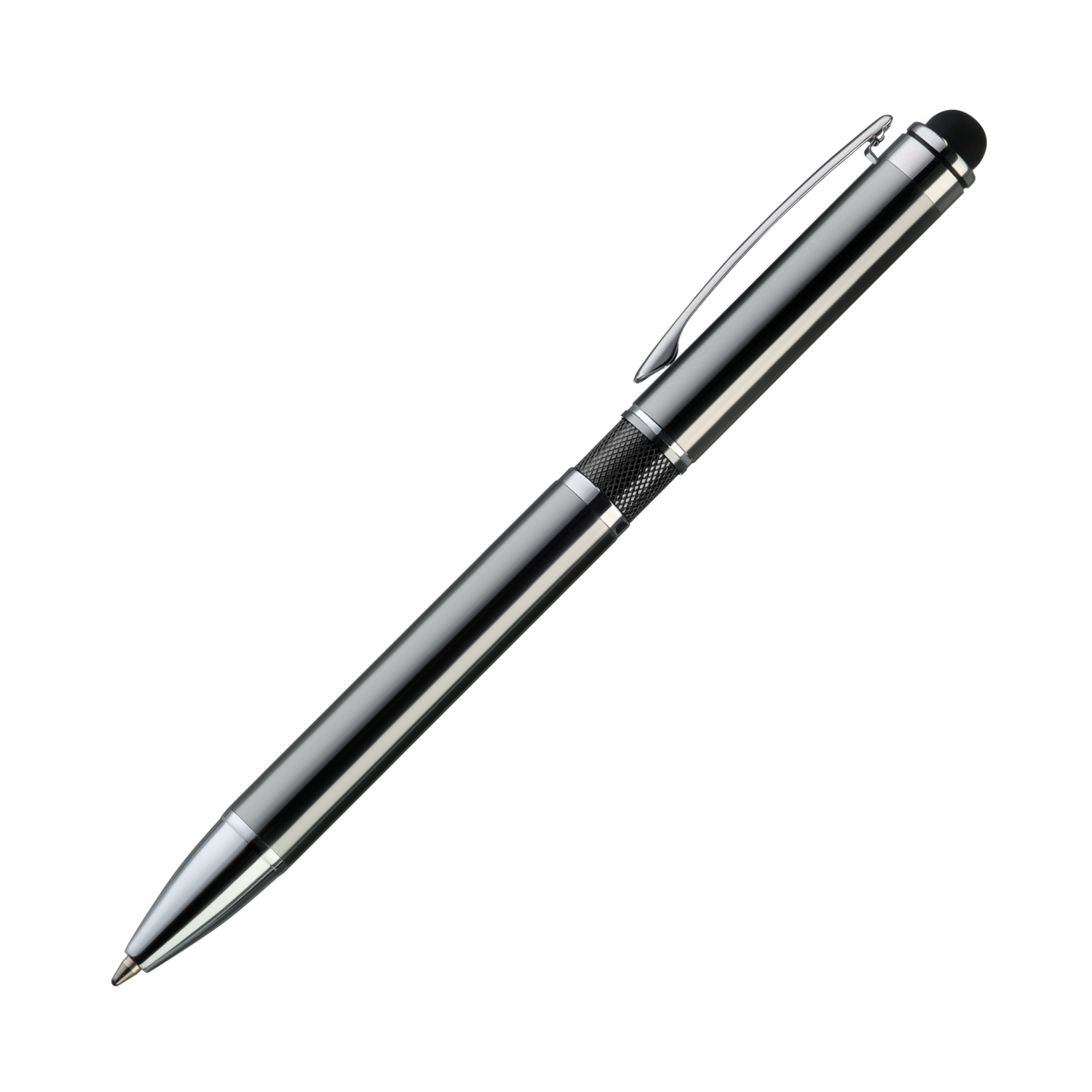 Классическая ручка цвета металлик с цветными деталями. Оснащена стилусом для работы с сенсорными экранами.