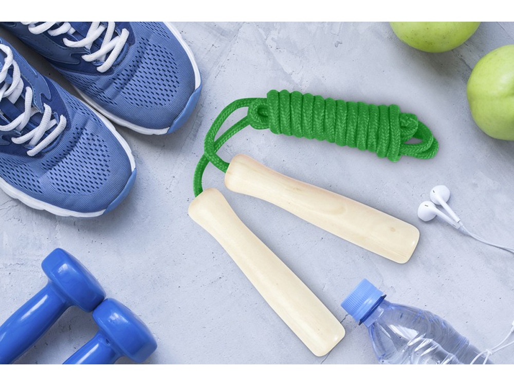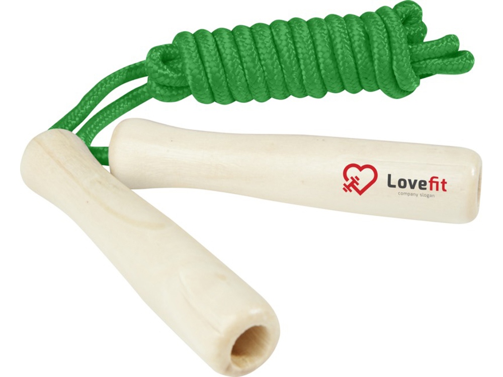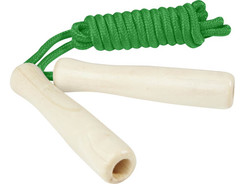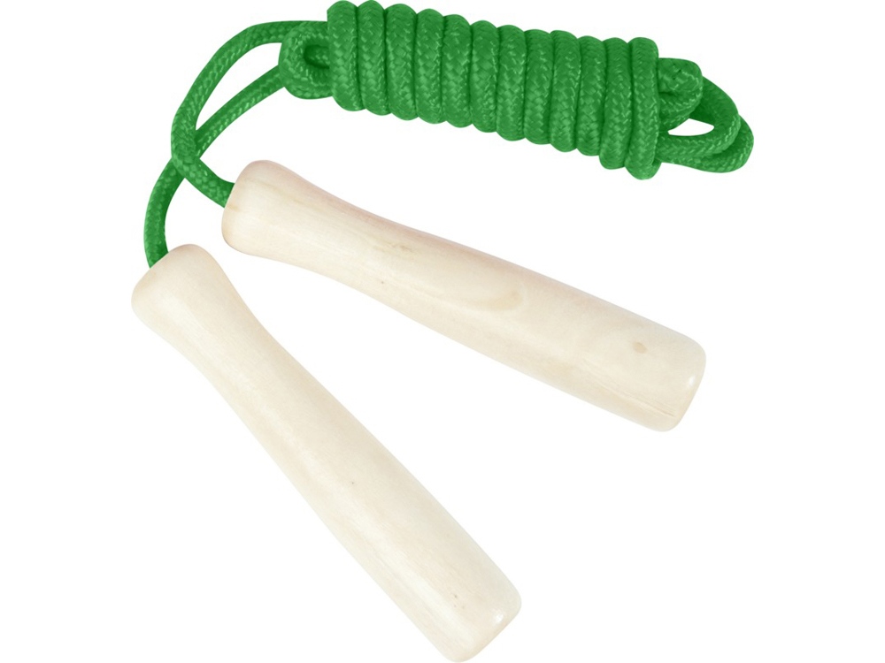 С этой скакалкой ваши дети смогут одновременно заниматься физической активностью и весело играть. Трос из полиэстера представлен в разных ярких цветах, которые привлекают внимание ребенка, а ручки сделаны из дерева. Длина троса составляет 245 см, поэтому эта скакалка подходит для детей ростом до 160 см. В качестве экологически чистого варианта декорирования рекомендуется лазерная гравировка.