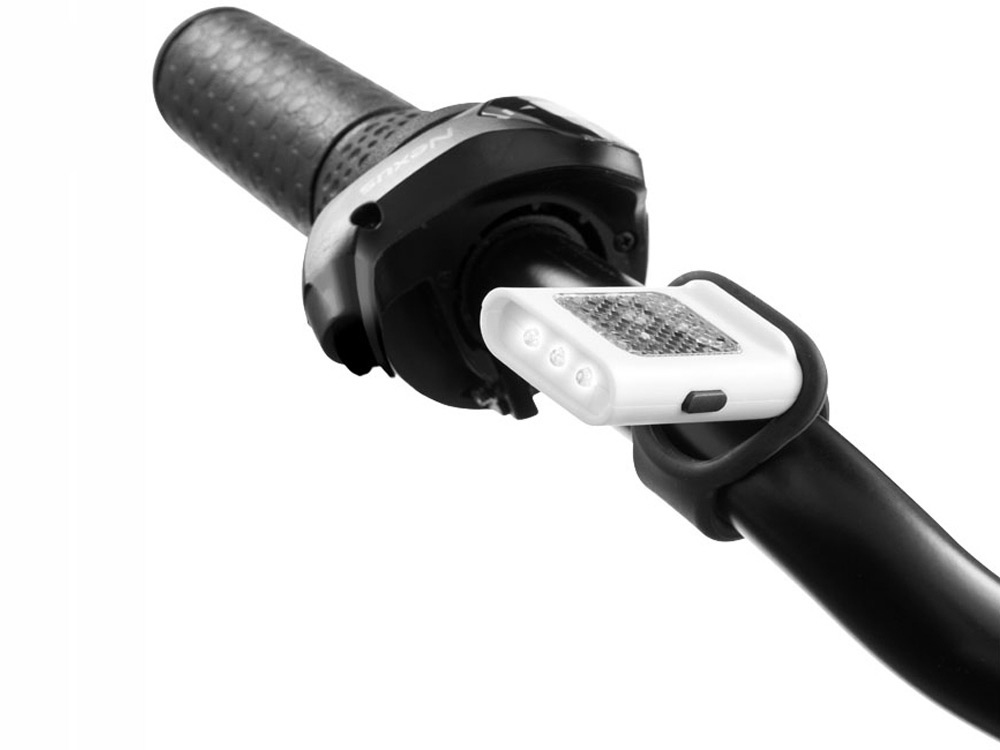 Отражатель для использования на улице с 3 яркими белыми светодиодами и функцией равномерного мигания. Эластичный силиконовый ремень для удобного присоединения к велосипеду или сумке.