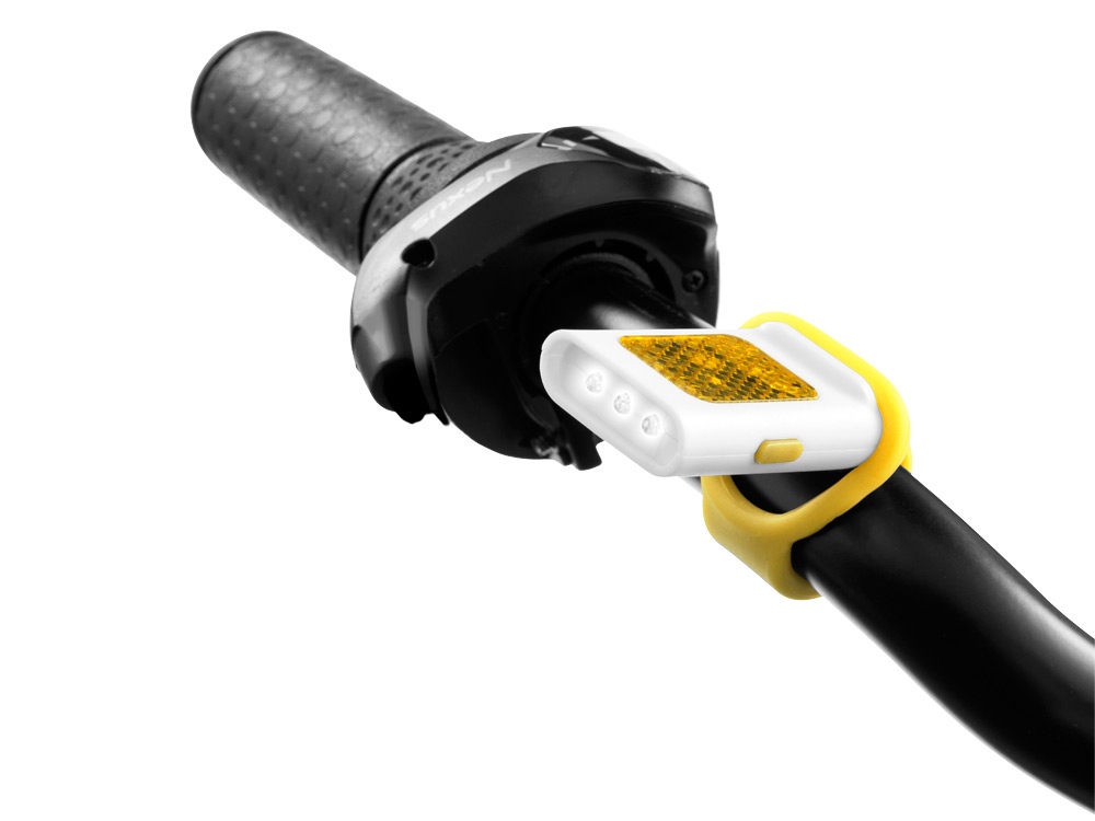 Отражатель для использования на улице с 3 яркими белыми светодиодами и функцией равномерного мигания. Эластичный силиконовый ремень для удобного присоединения к велосипеду или сумке.