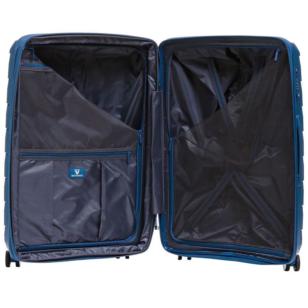 - Чемодан с 2 отделениями: одно из них с фиксирующими ремнями и сетчатой шторкой на молнии, второе — с разделителем на молнии