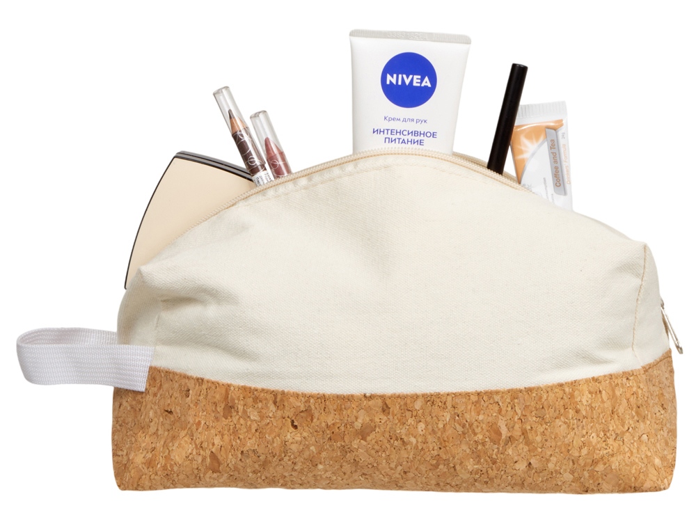 Большой вместительный несессер изготовлен из натуральных материалов- хлопка и пробки. Закрывается на молнию. Сбоку ручка для удобства использования.