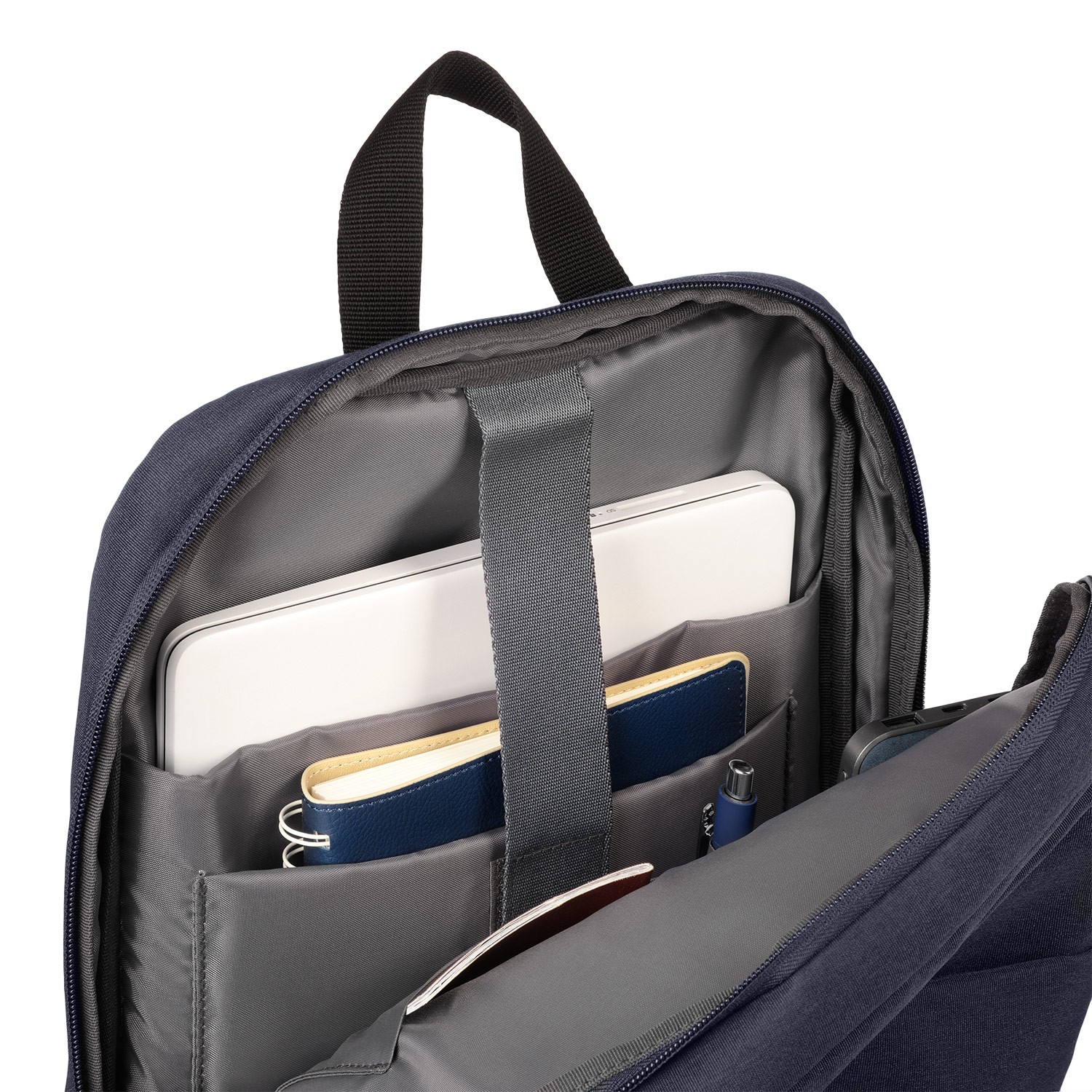 Компактный городской рюкзак Forst. С внешней стороны рюкзака размещены два кармана на молнии: один небольшой, который можно использовать для телефона, ключей, проездных карточек и других мелочей, другой – вместительный, для более крупных предметов.